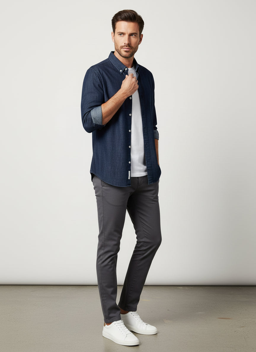 La camicia denim con colletto alla coreana è l'alleato perfetto per chi desidera unire comfort e stile. Realizzata in pregiato cotone, offre una sensazione di morbidezza al tatto, rendendola ideale per le giornate autunnali e invernali. Il suo design versatile la rende facilmente abbinabile a diversi outfit: indossala sopra una t-shirt bianca per un look casual, oppure sotto un blazer per un tocco più elegante. I bottoni in contrasto e il colletto alla coreana aggiungono un tocco di originalità, mentre le maniche lunghe possono essere arrotolate per un effetto più rilassato. Abbinala a un paio di pantaloni chinos e sneakers bianche per un look urbano e alla moda, oppure a jeans scuri per un outfit più classico. Non dimenticare di completare il tuo look con accessori minimalisti, come un orologio in pelle o una cintura coordinata. Questa camicia è perfetta per ogni occasione, dal lavoro al tempo libero, e rappresenta un investimento sicuro per il tuo guardaroba. Scegli la camicia denim con colletto alla coreana e porta il tuo stile a un livello superiore.