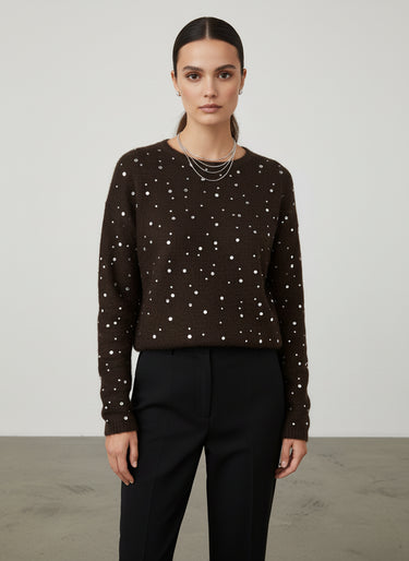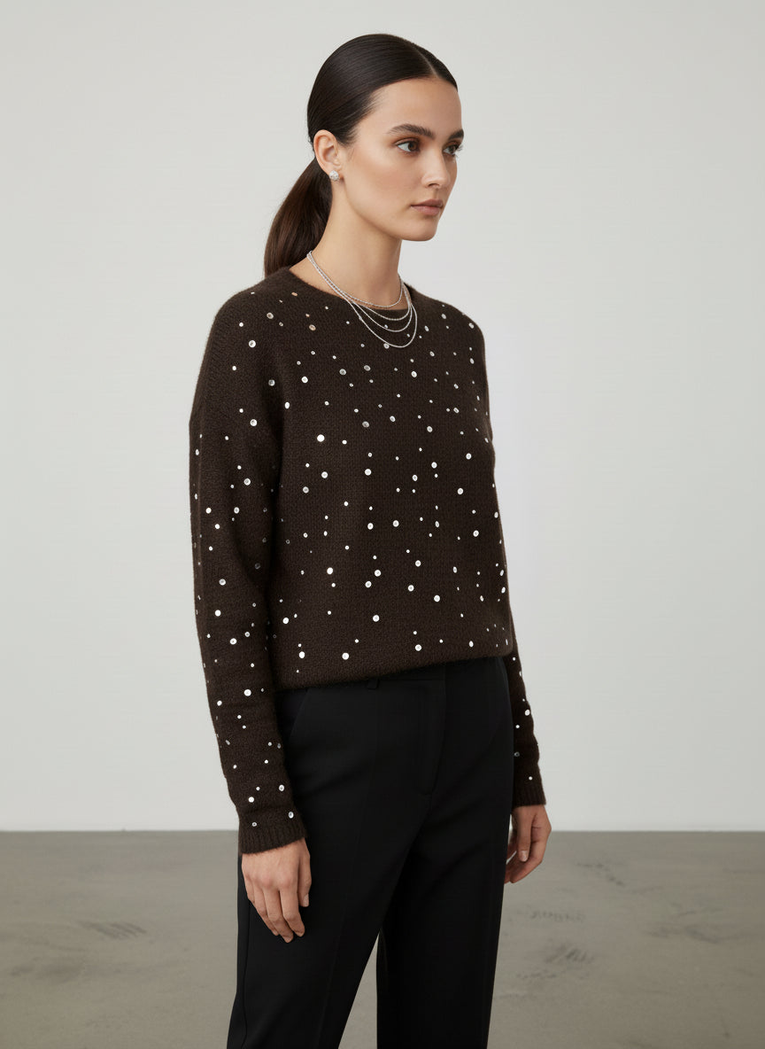 La maglia con brillanti chic è l'elemento di stile che non può mancare nel tuo armadio per la stagione autunnale. Realizzata con una pregiata miscela di lana e poliammide, questa maglia offre una sensazione di calore e morbidezza sulla pelle, perfetta per affrontare le giornate più fresche. Il suo design elegante, caratterizzato da un motivo a pois bianchi su fondo marrone, la rende versatile e adatta a molteplici occasioni.