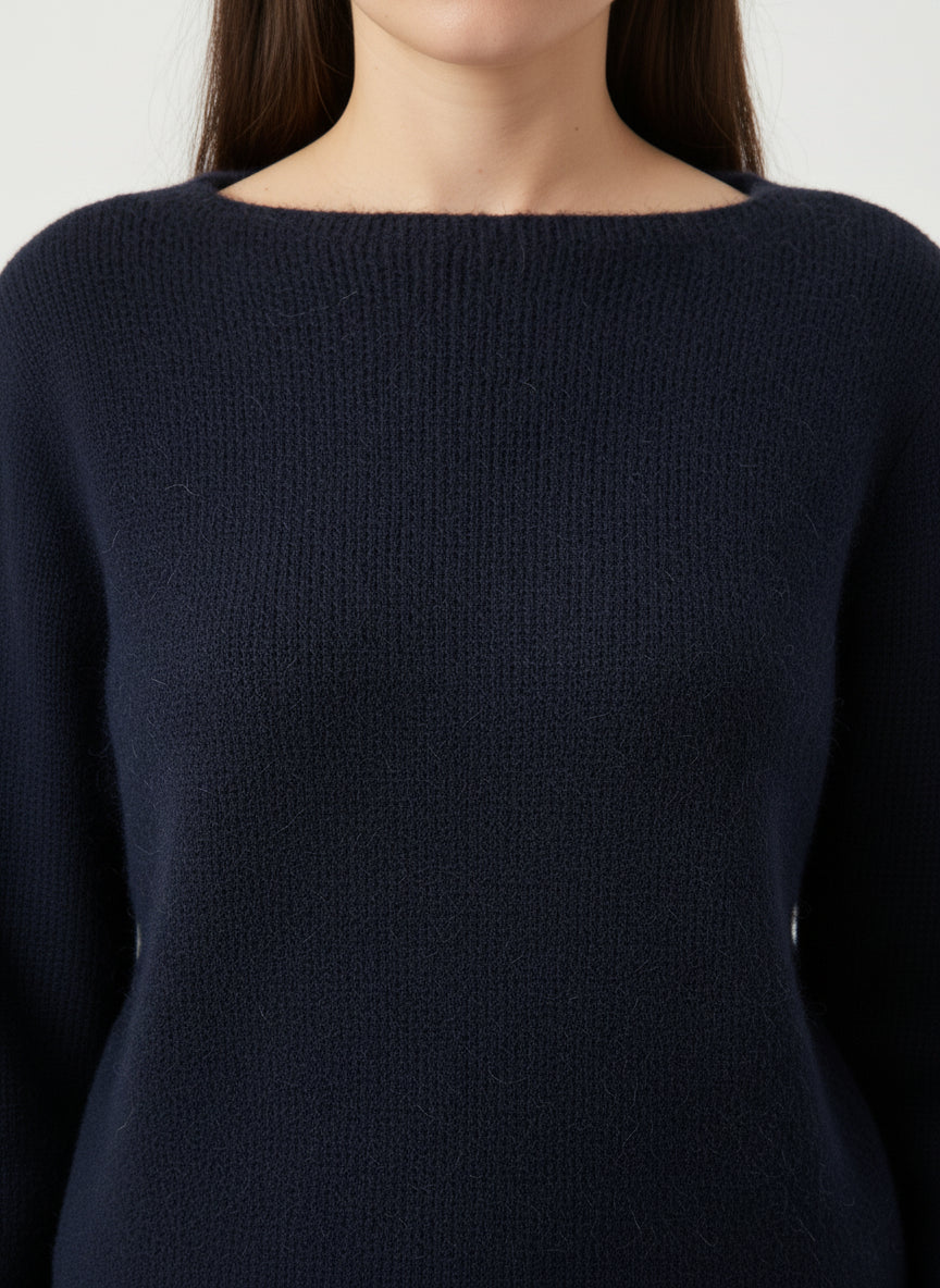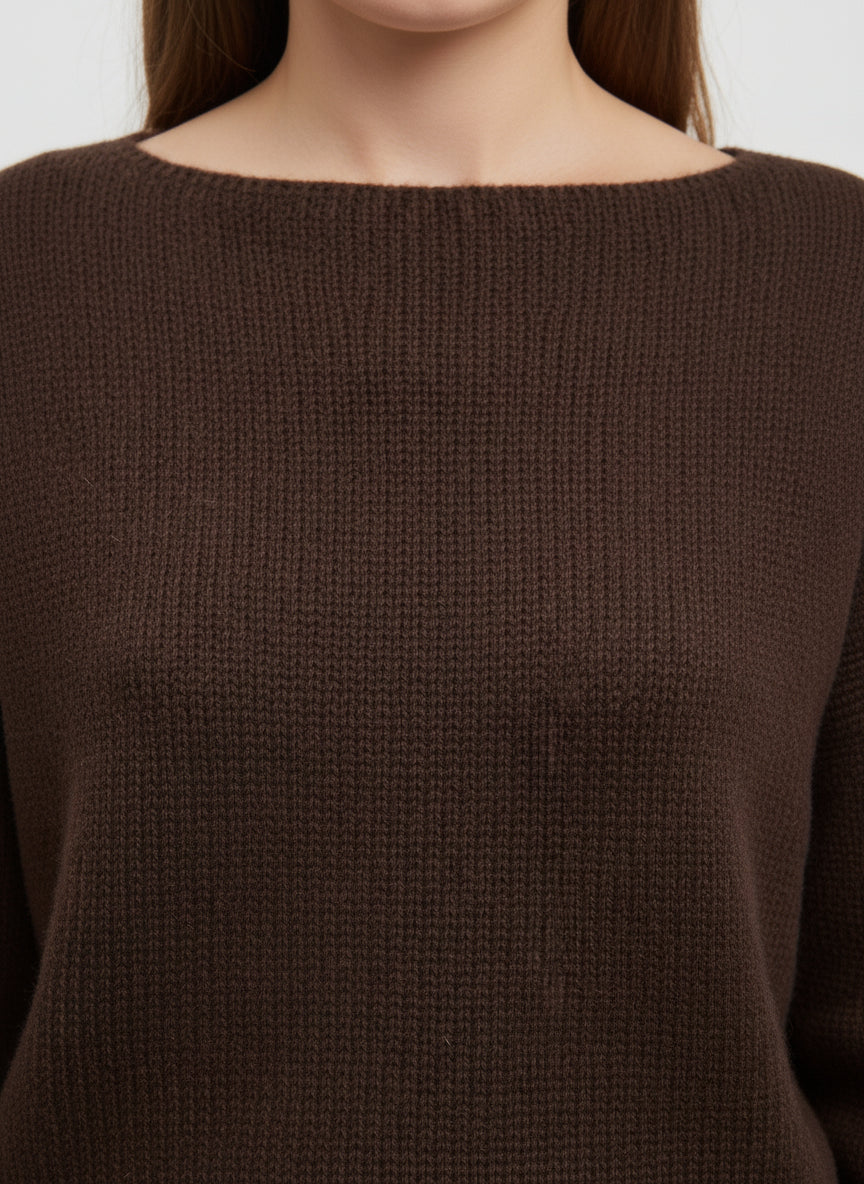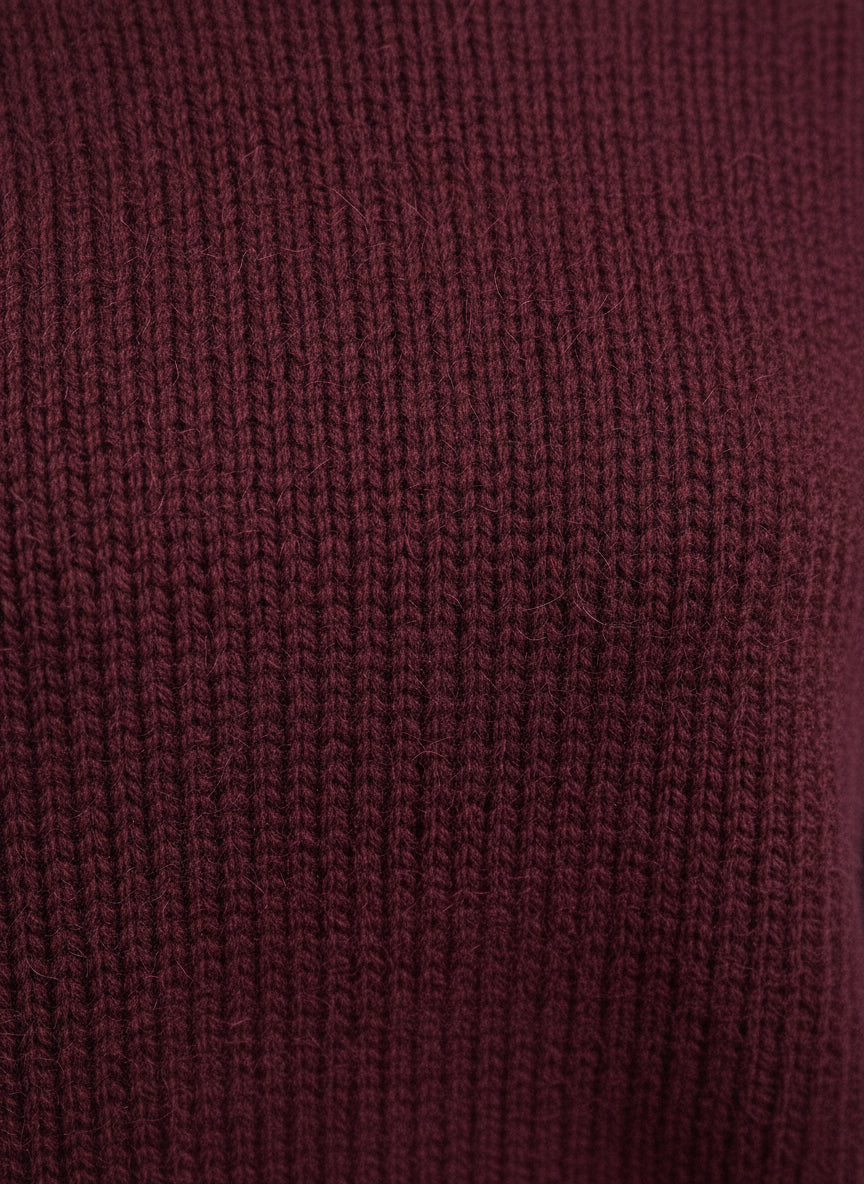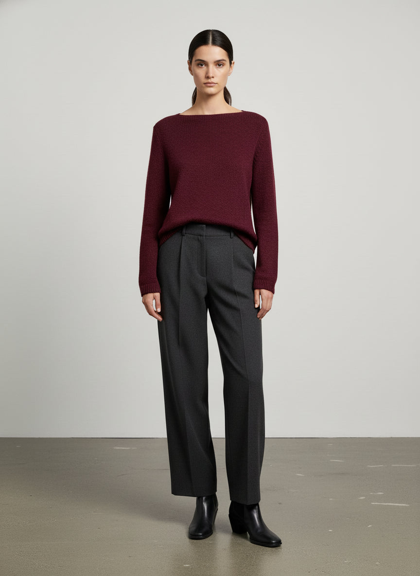 Il colore bordeaux intenso aggiunge un tocco di calore e raffinatezza, rendendola ideale per essere abbinata a tonalità neutre come il grigio o il beige. I dettagli costruttivi, come le maniche lunghe e il bordo a costine, conferiscono un tocco di eleganza, mentre il collo rotondo mantiene un'aria casual e moderna.