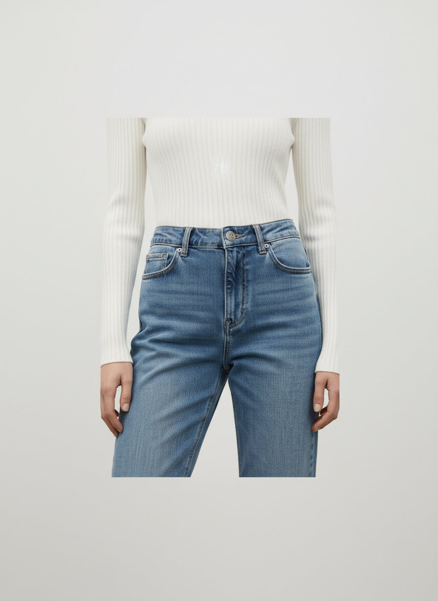 La lunghezza dei jeans, che termina appena sopra la caviglia, è perfetta per mettere in mostra un paio di scarpe alla moda, che siano sneakers o décolleté. Non dimenticare di giocare con le proporzioni: un top più ampio può bilanciare la silhouette slim dei jeans, creando un look armonioso e trendy.