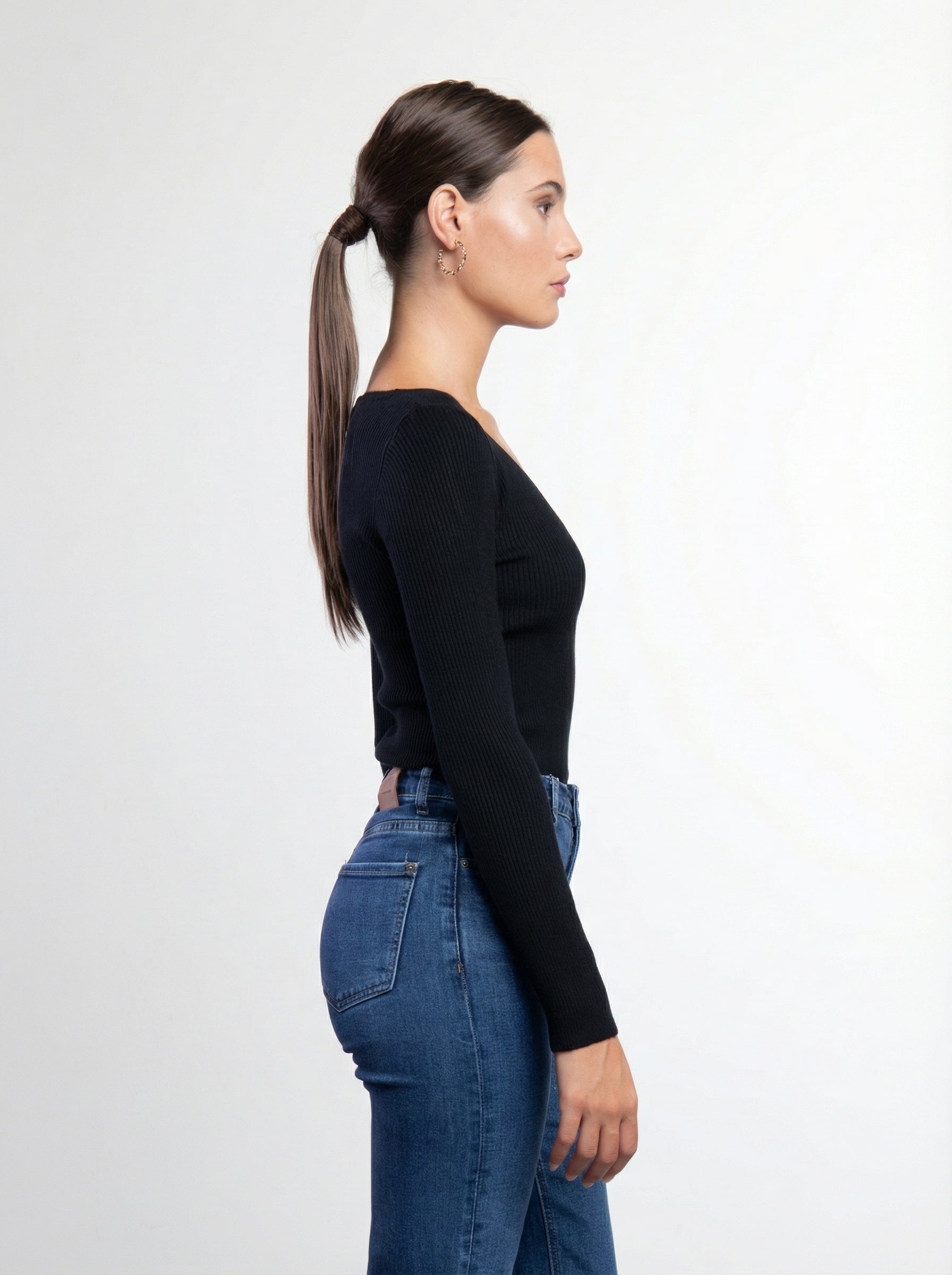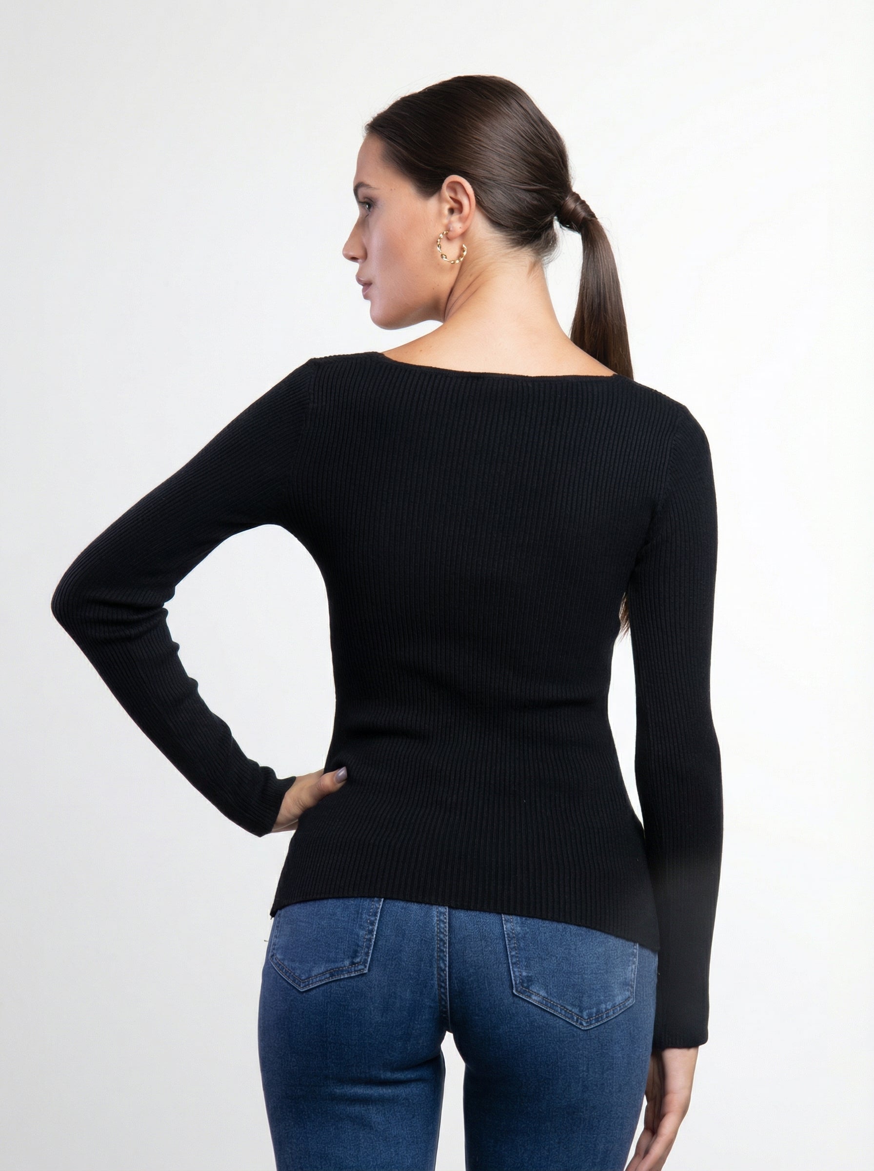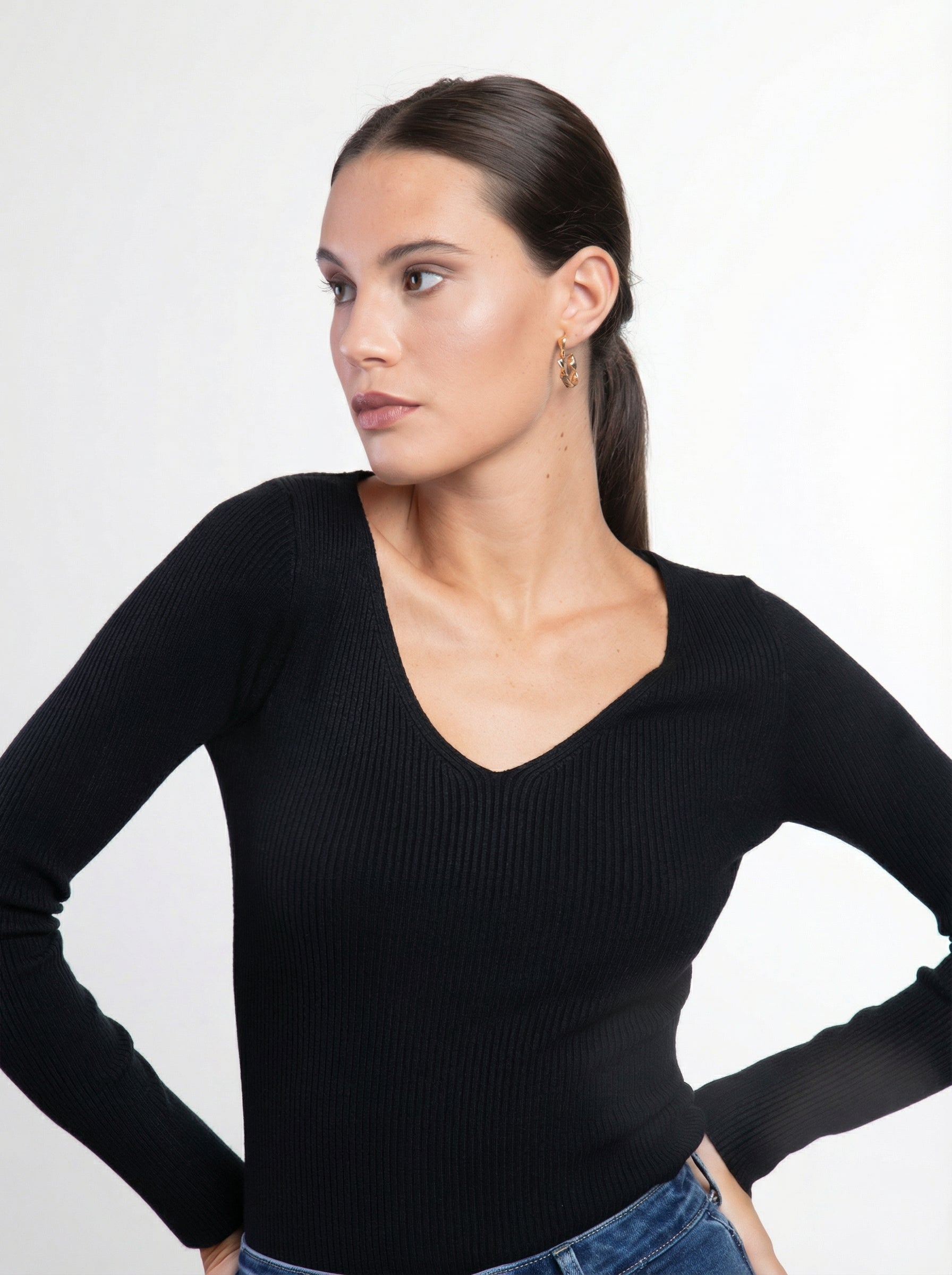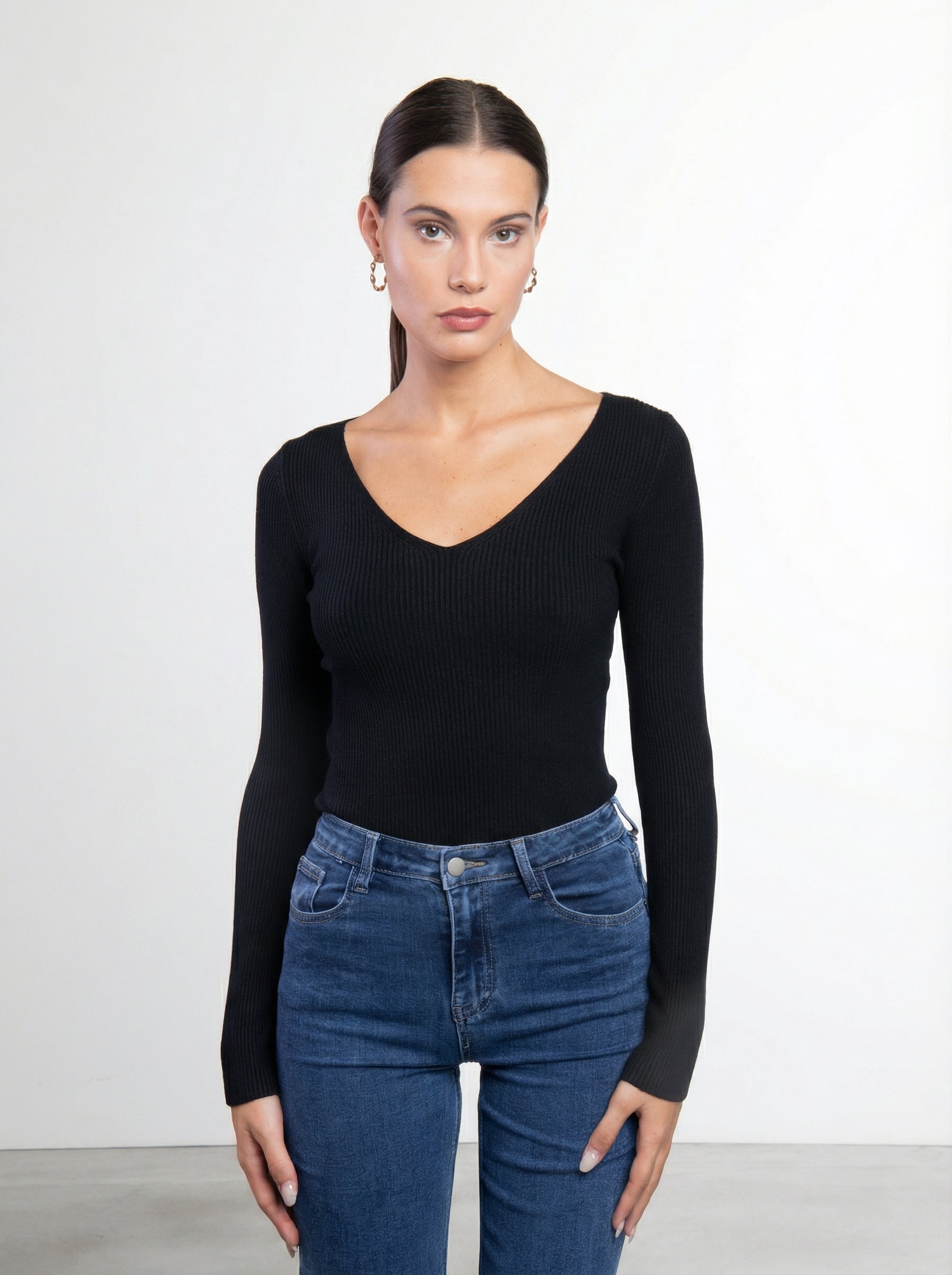La maglia è disponibile in un classico nero, un colore che non passa mai di moda e che si adatta a qualsiasi combinazione. La sua vestibilità aderente valorizza le forme senza risultare eccessiva, rendendola perfetta per ogni tipo di silhouette. Inoltre, la qualità dei materiali utilizzati garantisce una sensazione di morbidezza sulla pelle, ideale per le giornate più fresche.