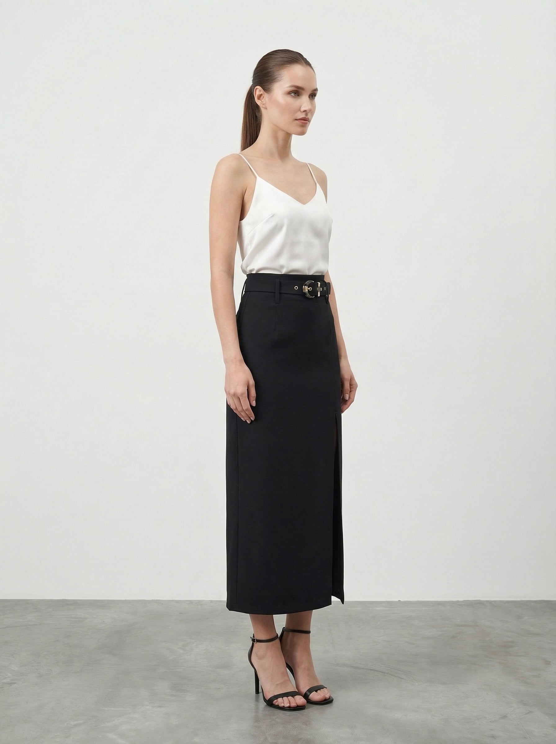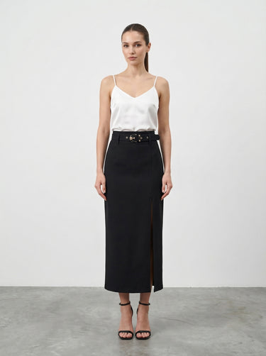 Gonna midi aderente a vita alta, essenziale per la Primavera-Estate. Caratterizzata da un audace spacco frontale e una cintura coordinata con fibbia metallica, esalta la silhouette con raffinata eleganza. Il morbido cotone offre comfort impeccabile per ogni occasione. Versatile e chic.