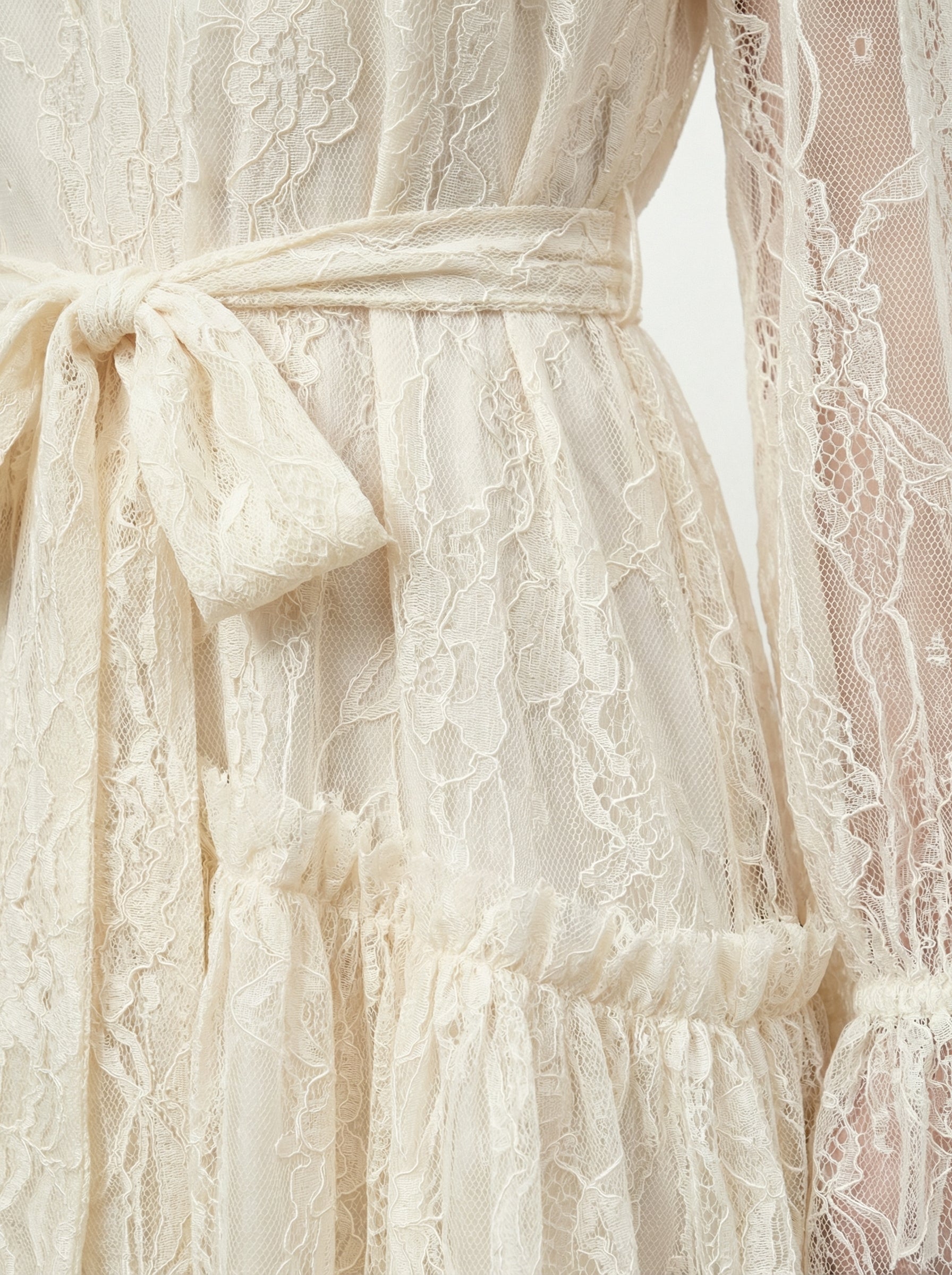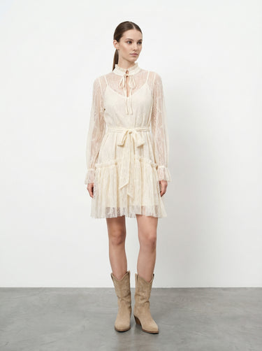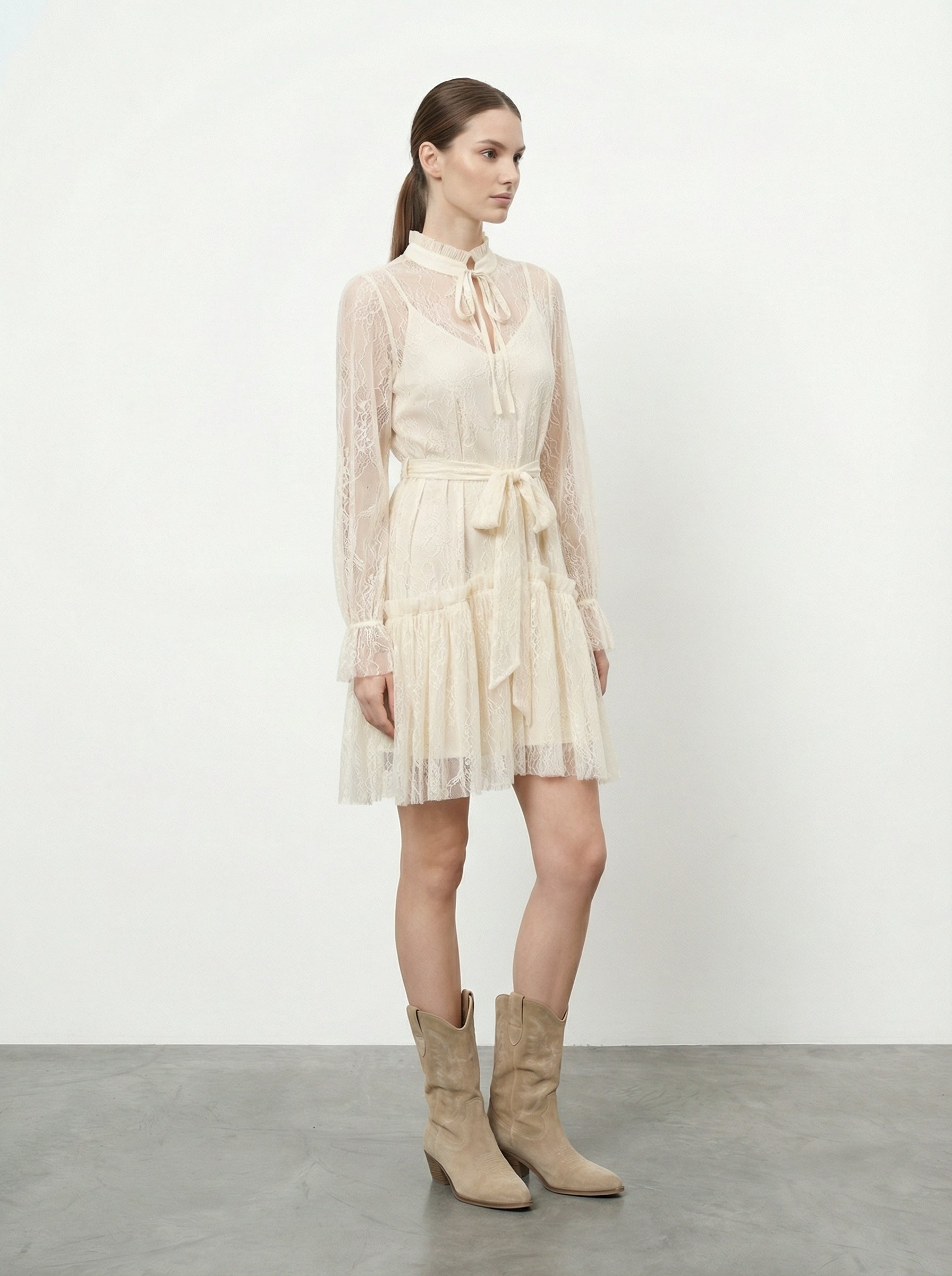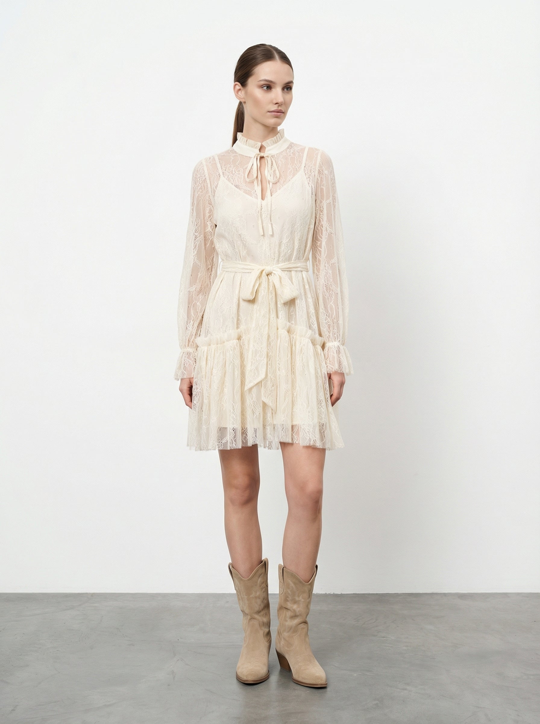 L'abito corto in pizzo è il capo che non può mancare nel tuo guardaroba primaverile. Realizzato con una delicata lavorazione in pizzo, questo abito presenta una silhouette romantica e femminile, perfetta per esaltare la tua figura. Il colletto alla coreana e i dettagli in pizzo sulle maniche aggiungono un tocco di eleganza, mentre la cintura in vita permette di personalizzare la vestibilità, evidenziando il punto vita.