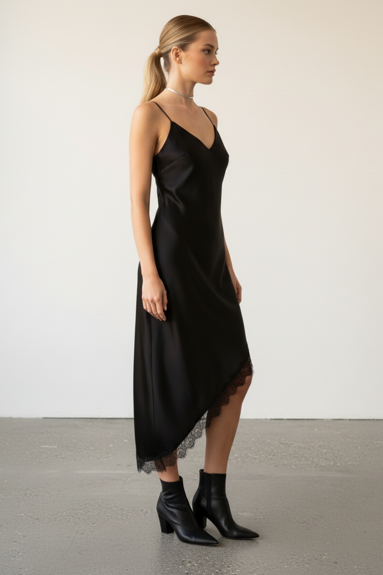 L’abito satinato con pizzo è l’emblema dell’eleganza moderna. Realizzato in un tessuto morbido e fluido, questo abito scivola delicatamente sulla pelle, offrendo una vestibilità impeccabile. La scollatura a V e le spalline sottili donano un tocco di sensualità, mentre il pizzo che orna l’orlo aggiunge un elemento di raffinatezza. Perfetto per una cena romantica o un evento formale, questo abito può essere facilmente abbinato a un paio di stivaletti in pelle per un look audace, oppure a delle décolleté per un tocco più classico. Non dimenticare di completare il tuo outfit con accessori minimalisti, come orecchini a cerchio e una clutch elegante. Questo abito è un vero e proprio passe-partout, capace di adattarsi a diverse occasioni, rendendoti sempre al centro dell’attenzione. Scegli di indossarlo con una giacca in pelle per un contrasto di stile che non passerà inosservato. Con il suo design sofisticato e i dettagli curati, l’abito satinato con pizzo è un investimento che arricchirà il tuo guardaroba per molte stagioni a venire.