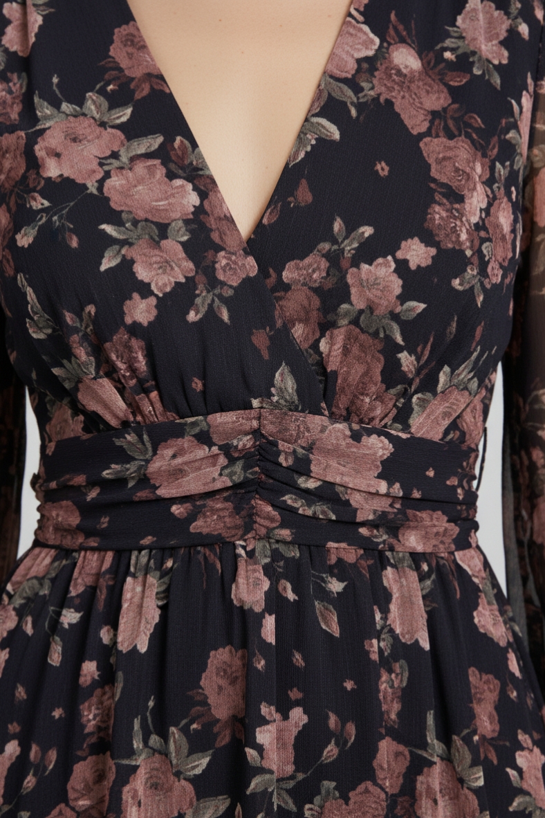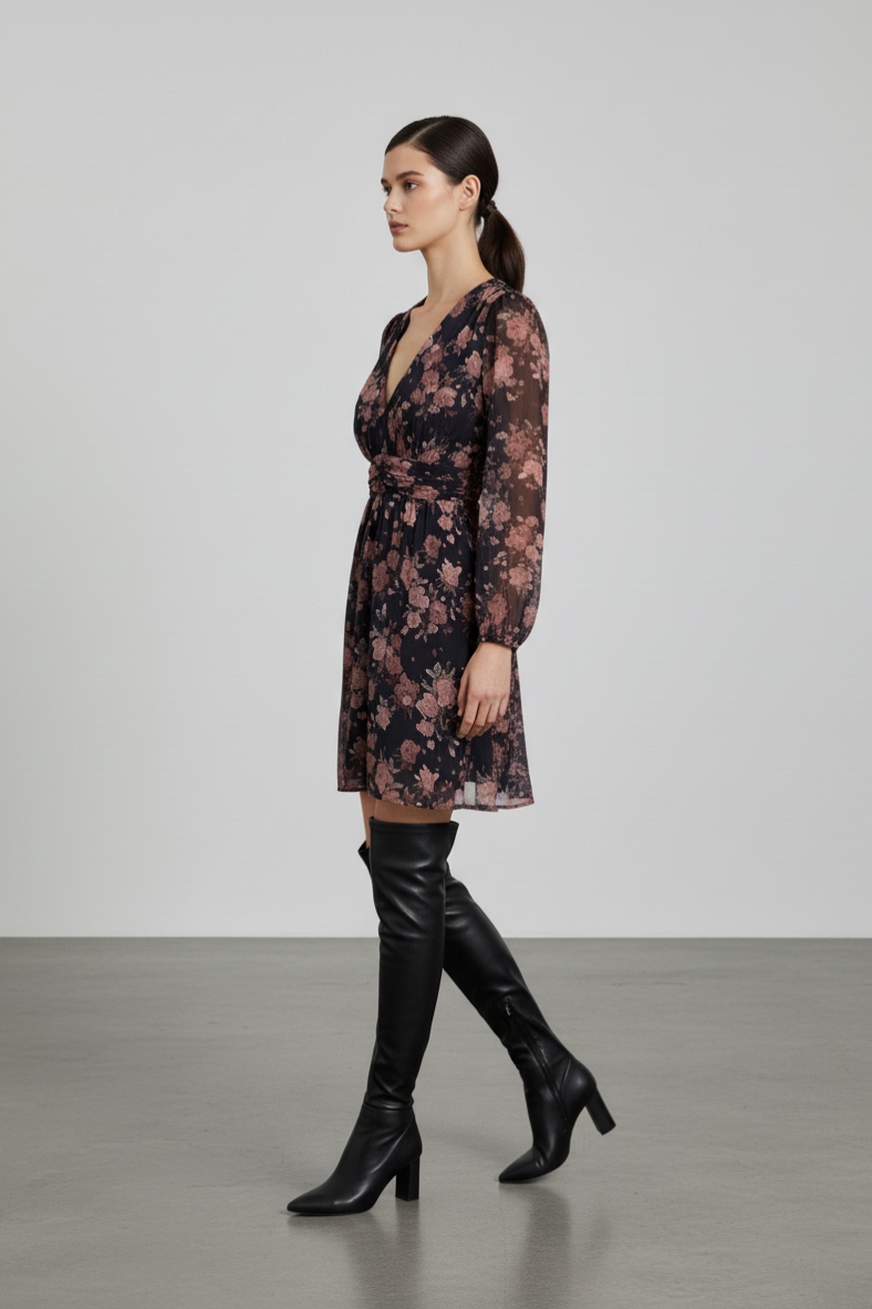 Le maniche a sbuffo aggiungono un tocco di originalità e modernità, mentre la scollatura a V valorizza il décolleté, rendendo questo abito adatto a diverse morfologie. La vita è accentuata da una cintura che permette di definire la silhouette, creando un effetto snellente e chic.