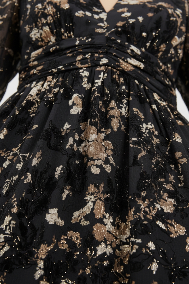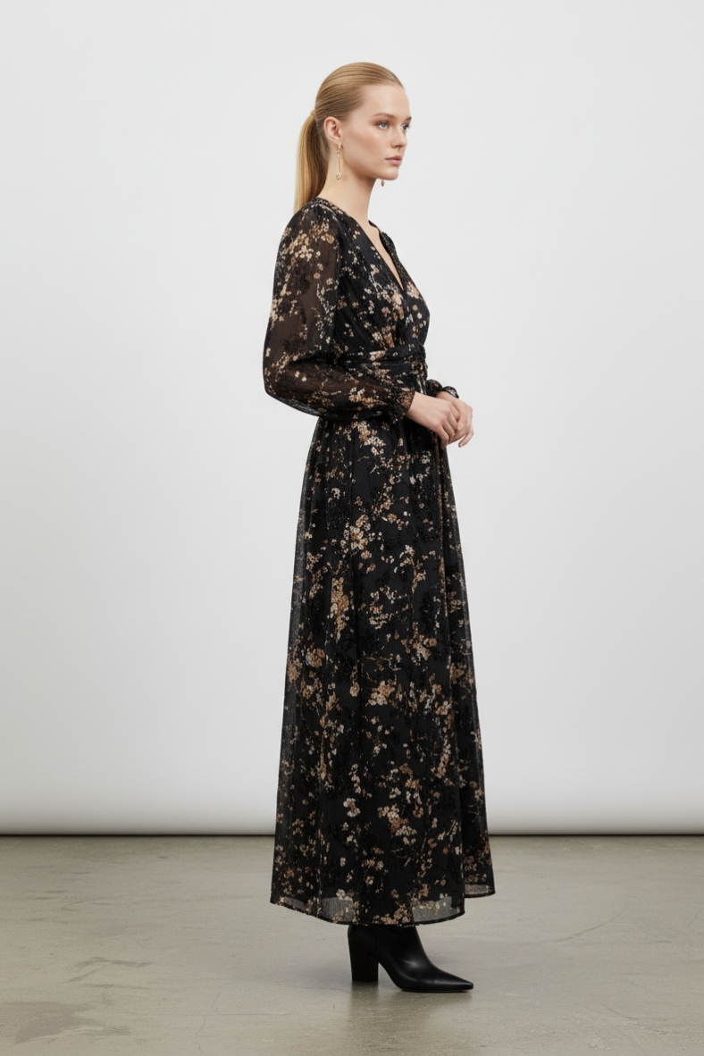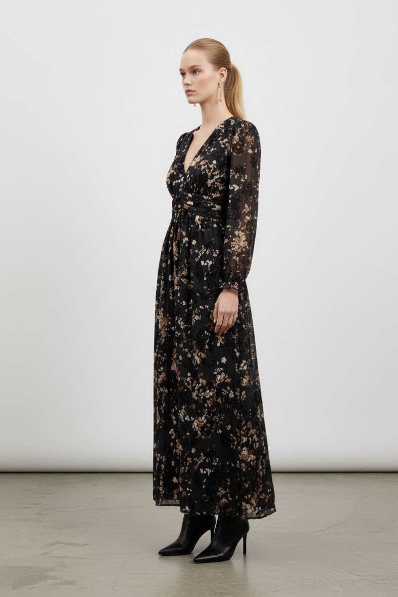 L’abito lungo floreale è l’emblema della femminilità e dell’eleganza. Realizzato in una morbida miscela di poliestere e viscosa, questo capo si adatta perfettamente alla silhouette, offrendo una vestibilità fluida e confortevole. Il suo scollo a V mette in risalto il décolleté, mentre le maniche lunghe con polsini elasticizzati aggiungono un tocco di romanticismo. La stampa floreale su fondo scuro è perfetta per l’autunno-inverno, portando un tocco di natura nel tuo guardaroba.