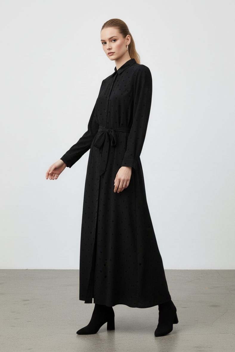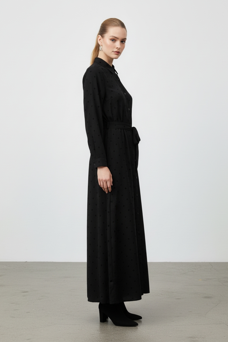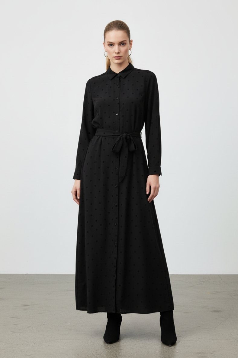 L’abito lungo a pois con cinturino è un capo d’abbigliamento che non può mancare nel guardaroba di ogni donna moderna. La sua silhouette fluida e il tessuto leggero in poliestere lo rendono perfetto per le stagioni più fresche, mentre il colletto e i bottoni frontali aggiungono un tocco di eleganza. La cintura in vita permette di esaltare la figura, creando un effetto slanciato e femminile.