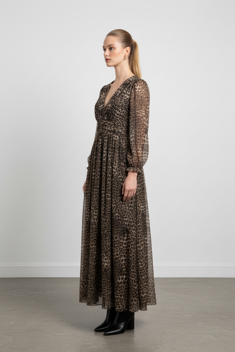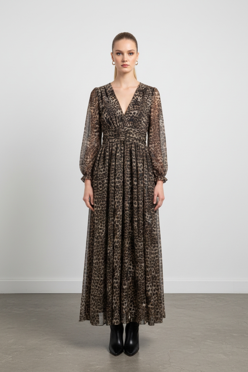 L’abito lungo leopardato è un capolavoro di stile e raffinatezza. Realizzato in un tessuto leggero e fluido, questo abito presenta una stampa leopardata che cattura l’attenzione e aggiunge un tocco di audacia al tuo look. La scollatura profonda e le maniche a sbuffo donano un’eleganza senza tempo, mentre la vita accentuata esalta la silhouette femminile. Perfetto per una serata elegante o un evento speciale, questo abito può essere abbinato a stivali alti per un look grintoso o a sandali con tacco per un tocco più sofisticato. Non dimenticare di completare il tuo outfit con accessori minimalisti, come orecchini a cerchio e una clutch in pelle, per un effetto chic e raffinato. Indossalo con un trucco naturale per un look fresco e luminoso, oppure osa con un rossetto audace per un effetto wow. Questo abito è la scelta ideale per chi desidera esprimere la propria personalità attraverso la moda, senza rinunciare al comfort e alla qualità. Scegli di essere unica con questo abito che parla di te.