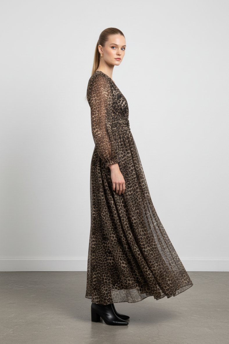 Questo abito lungo leopardato è un must-have per il tuo guardaroba. La sua stampa leopardata e il taglio elegante lo rendono perfetto per eventi speciali o serate fuori.