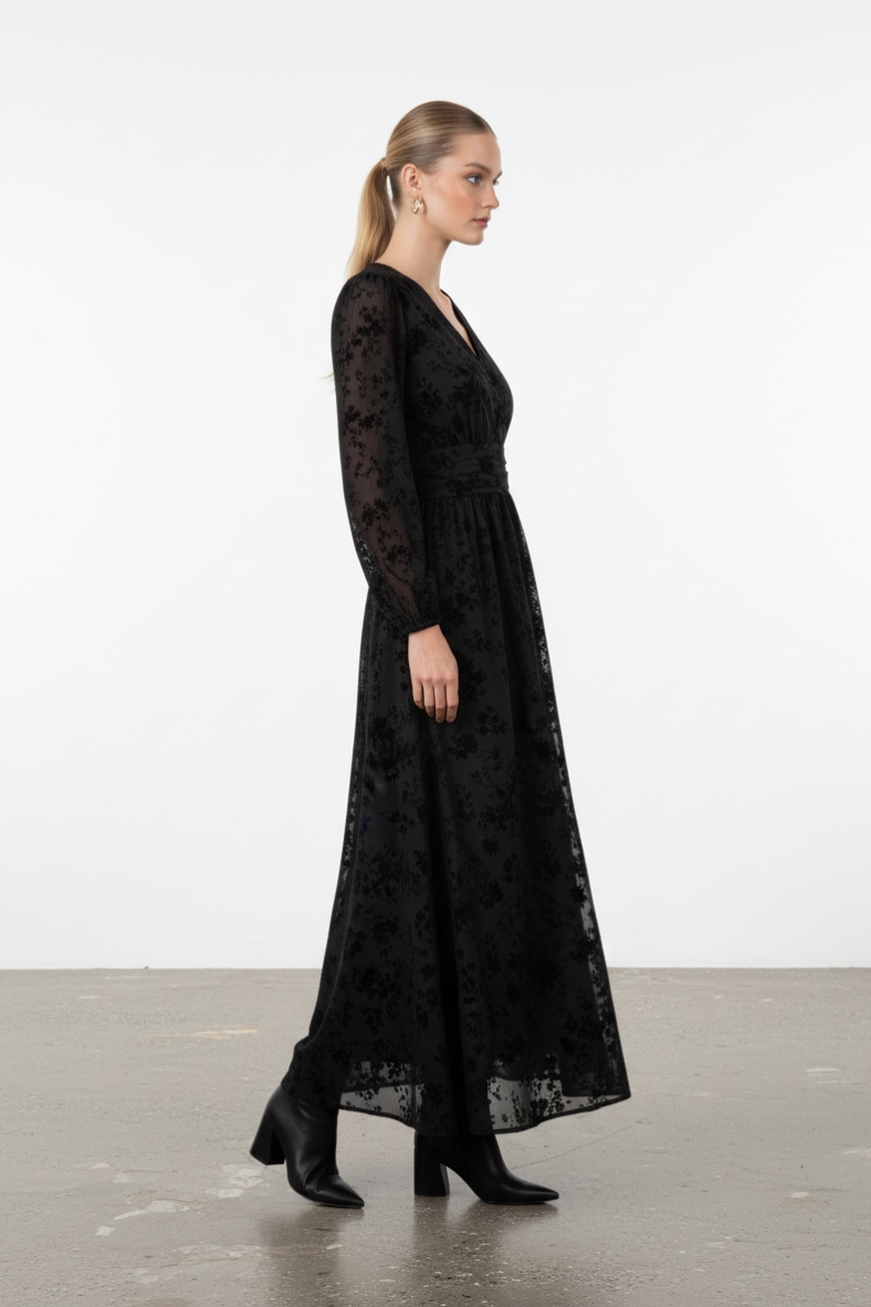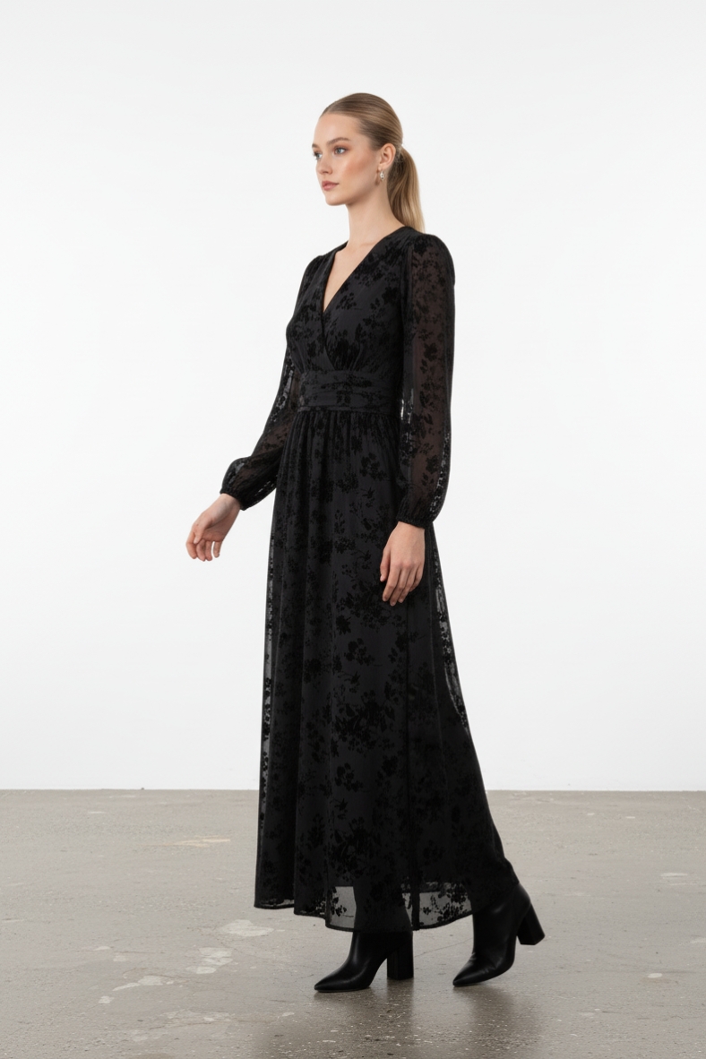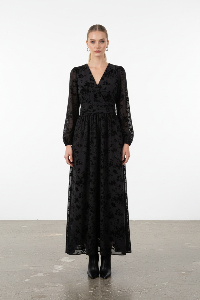 L’abito lungo con dettagli floreali in velluto è l’ideale per chi cerca un look sofisticato e alla moda. La sua silhouette fluida e il design elegante lo rendono perfetto per eventi speciali o serate romantiche. Realizzato in una pregiata miscela di poliestere e viscosa, questo abito non solo si adatta perfettamente al corpo, ma offre anche una sensazione di comfort e leggerezza sulla pelle. Le maniche a sbuffo aggiungono un tocco di femminilità, mentre la scollatura a V mette in risalto il décolleté in modo delicato e raffinato.