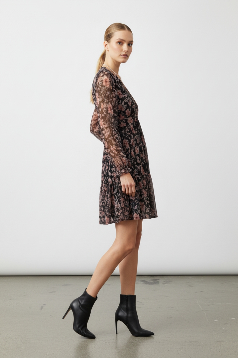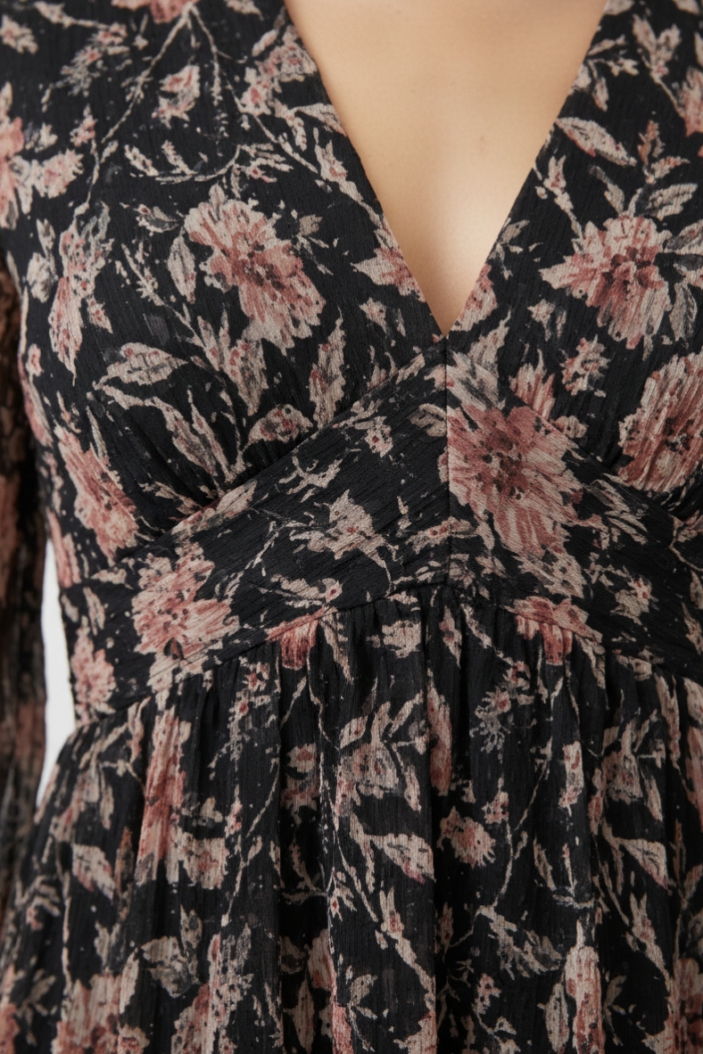 La scollatura a V mette in risalto il décolleté, mentre la vita elasticizzata definisce la silhouette, creando un effetto slanciato. Questo abito è perfetto per essere indossato in qualsiasi stagione, ma si presta particolarmente bene all’autunno-inverno, grazie alla sua eleganza intramontabile. Scegli questo abito floreale per esprimere il tuo stile unico e per sentirti sempre al meglio, sia che tu stia partecipando a un evento formale che a una cena informale con amici.