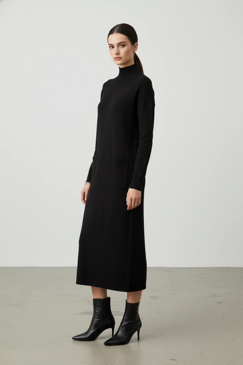 Questo abito midi con collo alto è un must-have per il tuo guardaroba autunnale. Realizzato in morbida viscosa, offre comfort e stile in ogni occasione.
