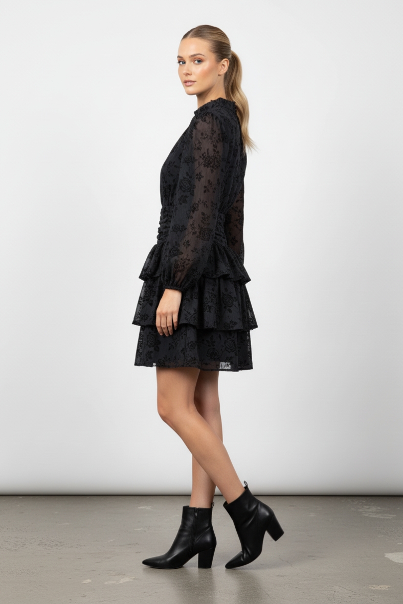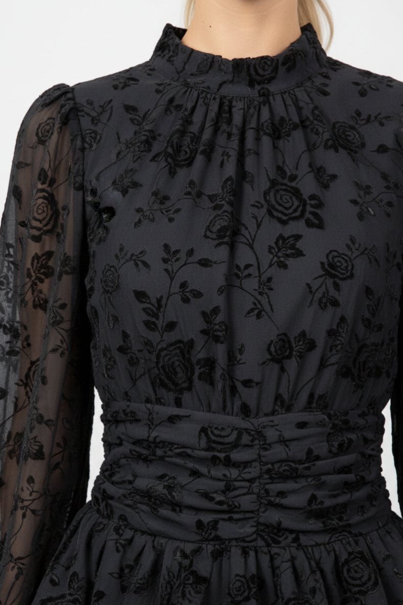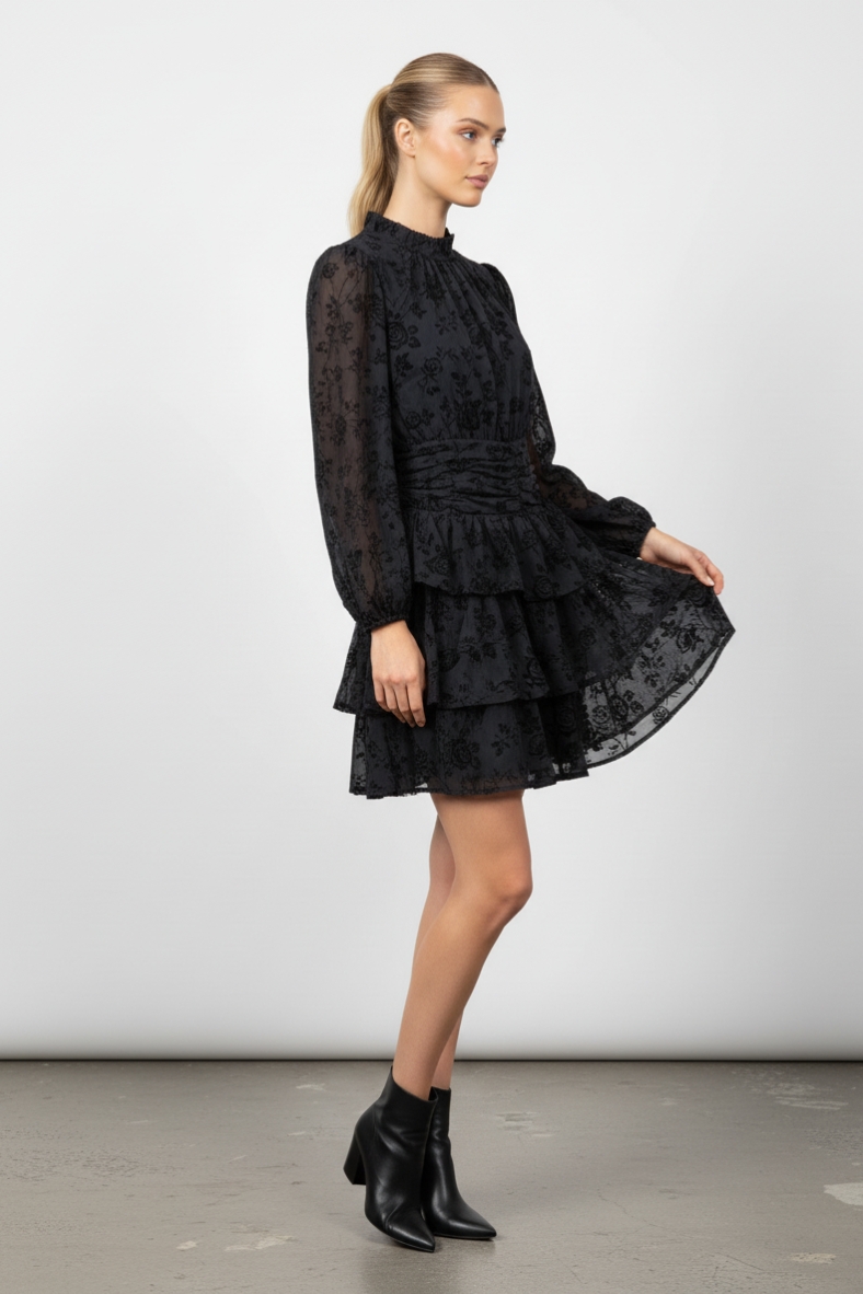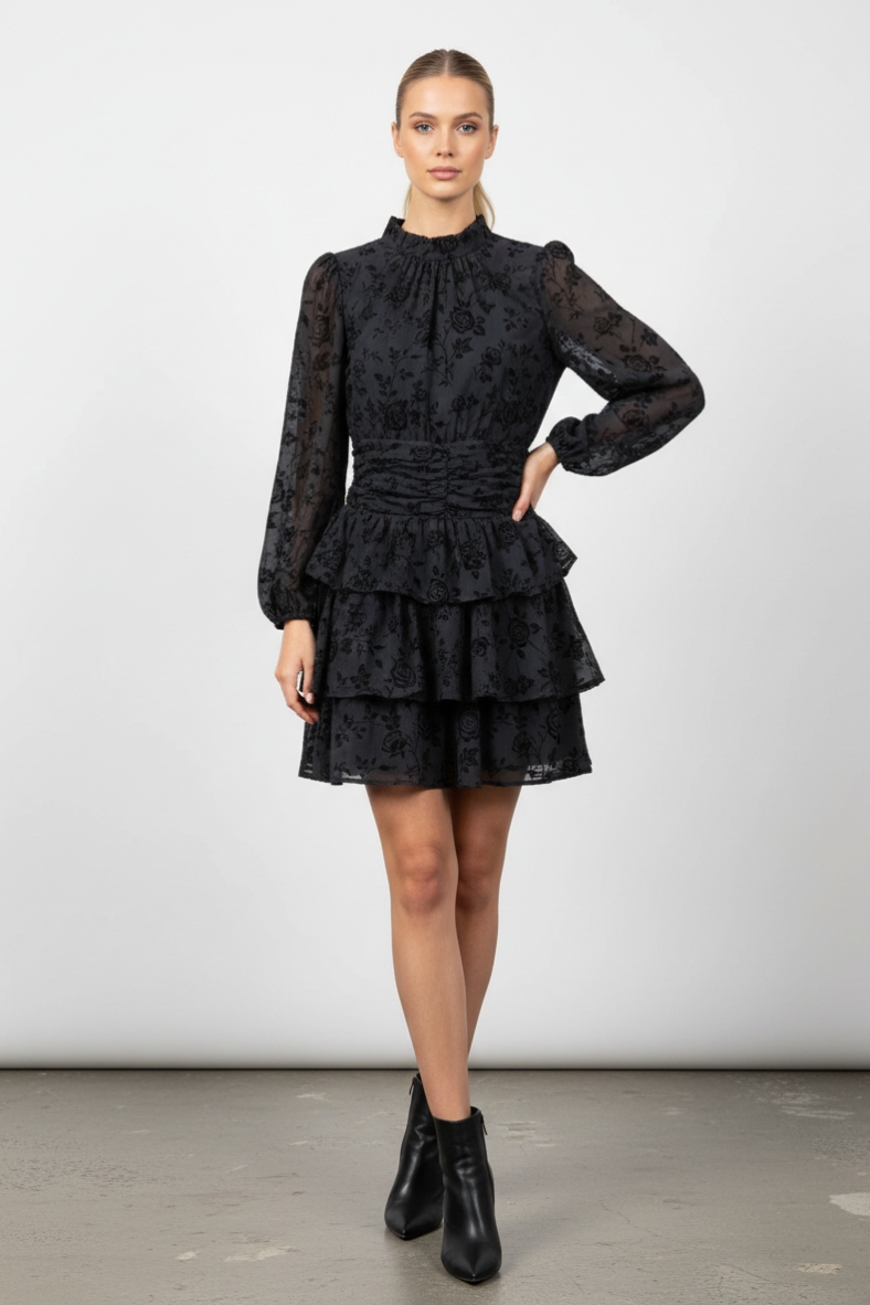 L’abito corto a fiori con gonna a balze è la scelta perfetta per chi desidera un look sofisticato e di tendenza. Caratterizzato da una silhouette che esalta la figura, questo capo è realizzato in un tessuto morbido e leggero, che scivola delicatamente sulla pelle, offrendo una sensazione di comfort senza pari. Le maniche lunghe e il colletto alto aggiungono un tocco di classe, mentre le ruches sul fondo creano un movimento affascinante ad ogni passo.
