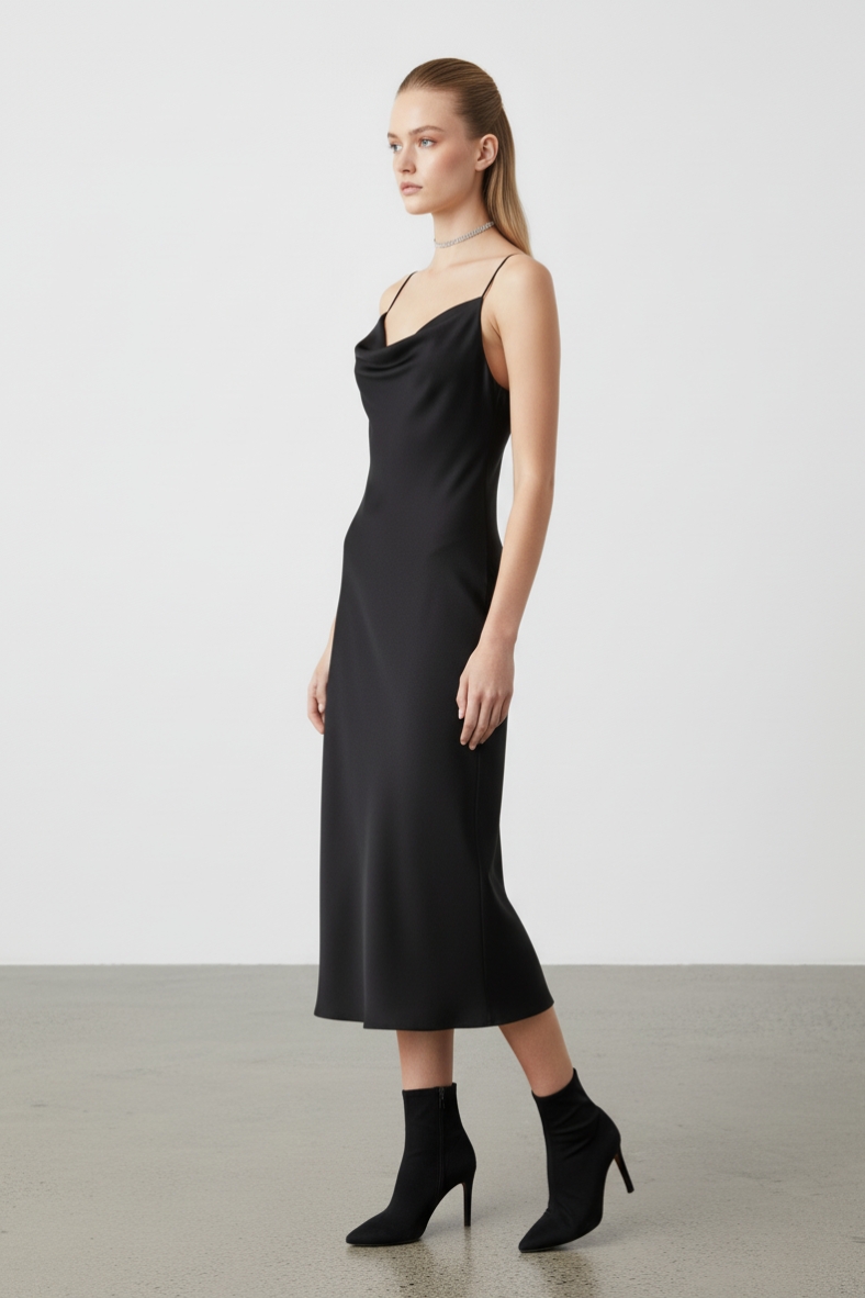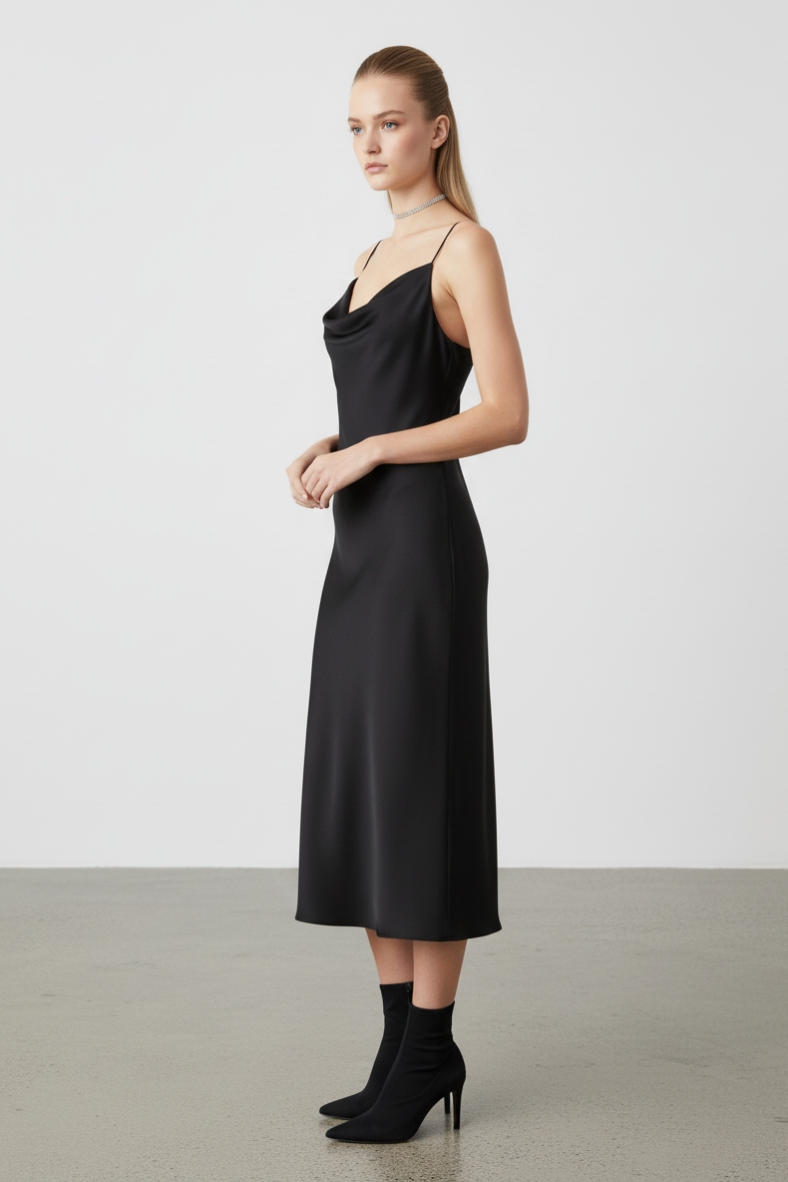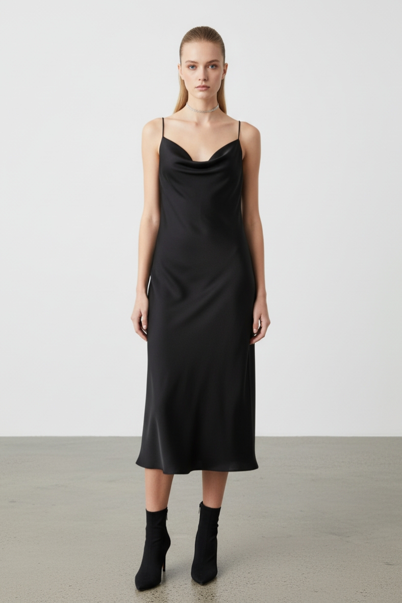 L’abito midi satinato elegante è l’emblema della femminilità e della raffinatezza. Realizzato in un tessuto morbido e fluido, questo abito scivola delicatamente sulla pelle, creando un effetto lusinghiero che esalta ogni silhouette. Le spalline sottili e lo scollo a cuore donano un tocco di sensualità, rendendolo perfetto per una serata speciale o un evento formale. La lunghezza midi aggiunge un’aria di sofisticatezza, mentre il colore nero classico lo rende estremamente versatile.