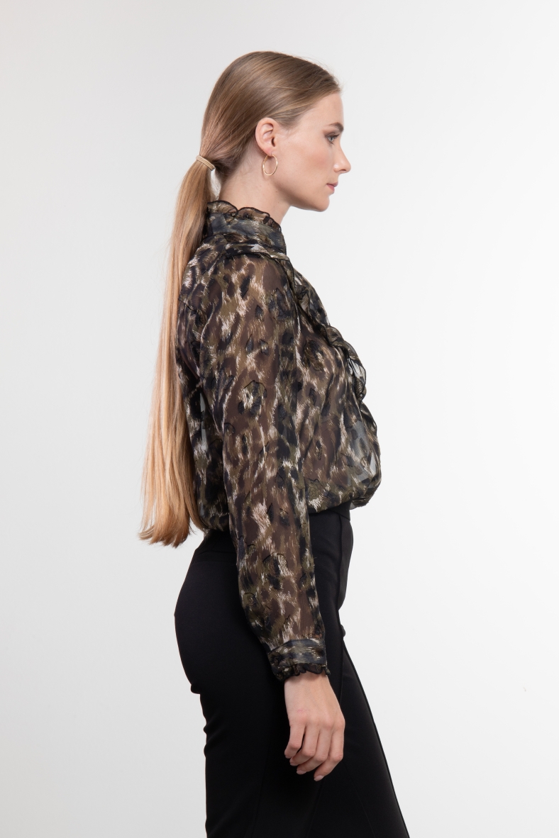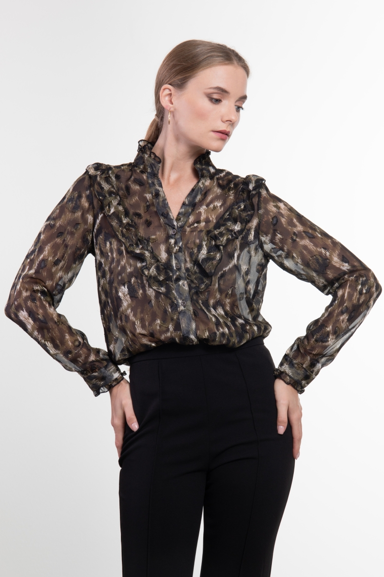 La camicia semitrasparente con volant è un must-have per il tuo guardaroba autunnale. Realizzata in poliestere di alta qualità, offre una vestibilità comoda e un tocco di eleganza. I dettagli in rouches lungo il colletto e le maniche aggiungono un fascino romantico, rendendola ideale per ogni occasione.