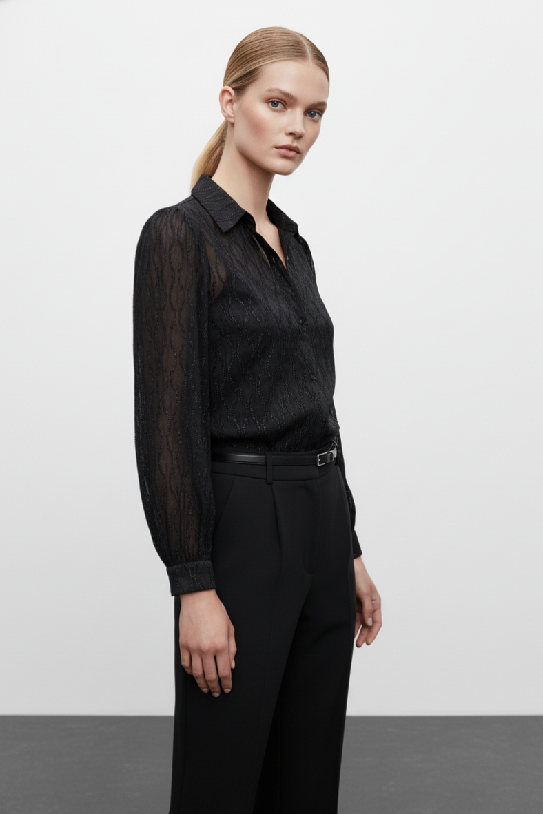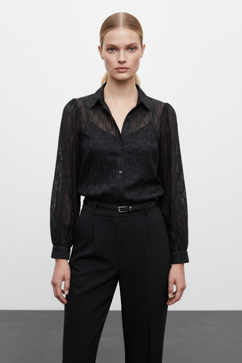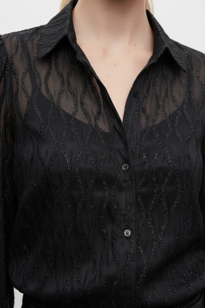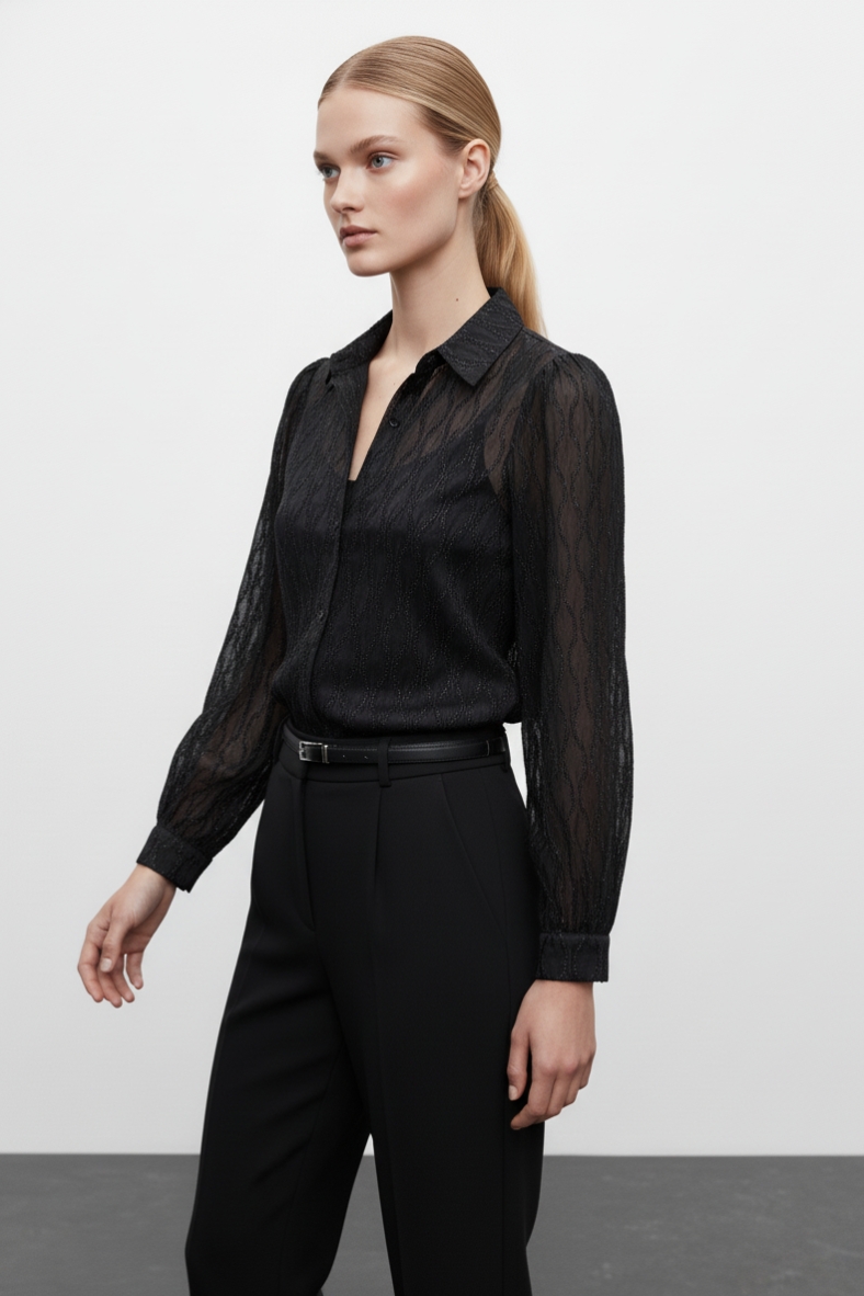 Questa camicia nera con trasparenze è un must-have per il tuo guardaroba. Realizzata con materiali di alta qualità, offre comfort e stile in ogni occasione.