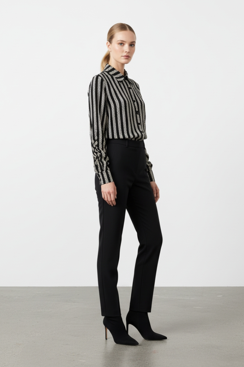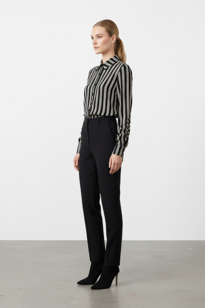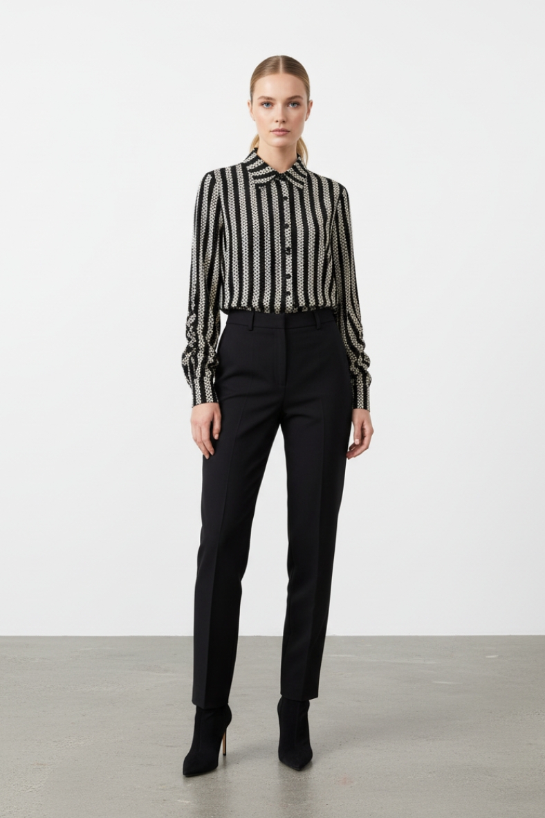 Questa camicia è ideale anche per un look casual-chic: indossala con jeans skinny e stivaletti per un’uscita informale ma curata. La sua versatilità la rende un capo indispensabile nel tuo guardaroba autunnale-invernale. Non perdere l’occasione di aggiungere questa camicia con stampa elegante alla tua collezione, un investimento sicuro per ogni occasione.