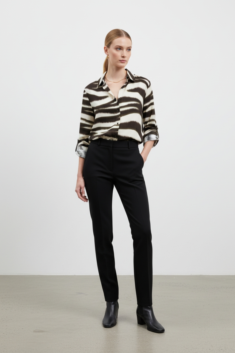 La camicia stampa zebra è il capo che non può mancare nel tuo guardaroba autunnale. Realizzata in viscosa di alta qualità, questa camicia è incredibilmente morbida al tatto e scivola delicatamente sulla pelle, garantendo comfort e stile in ogni momento della giornata. Il suo design audace, caratterizzato da una stampa a strisce che richiama il mondo animale, la rende perfetta per chi ama osare con eleganza.