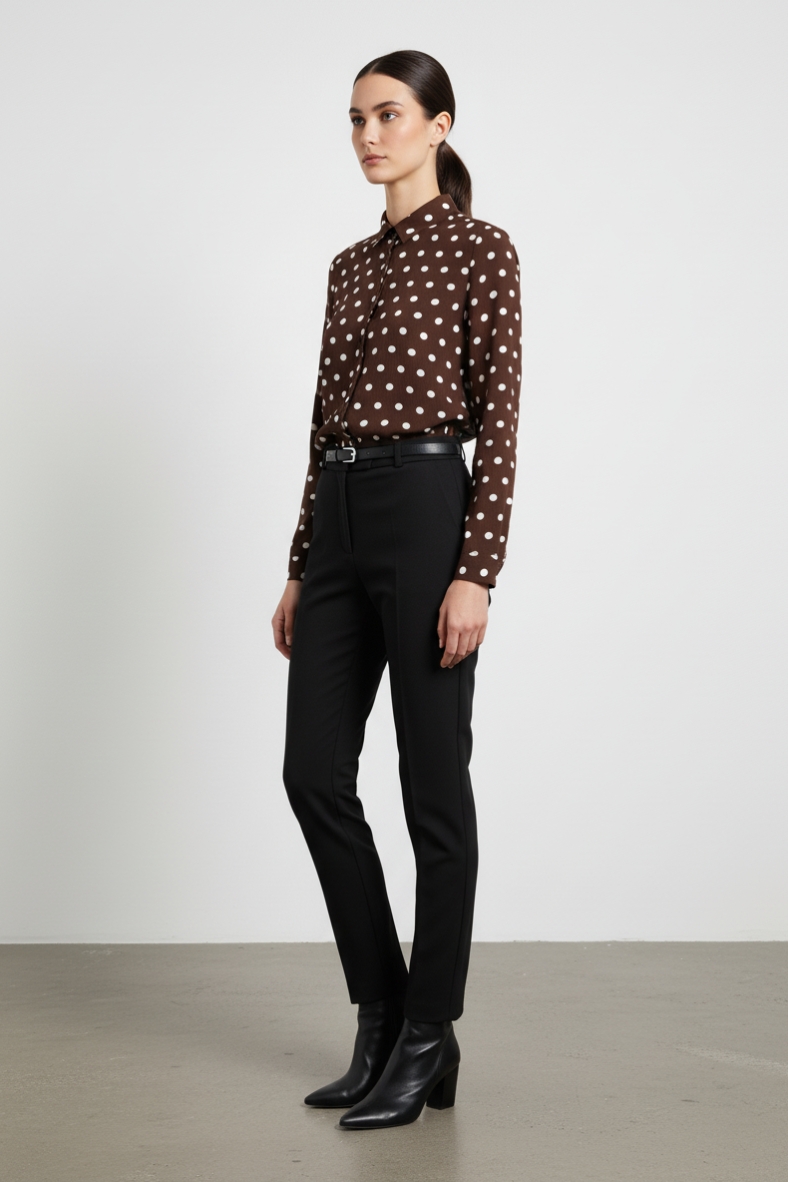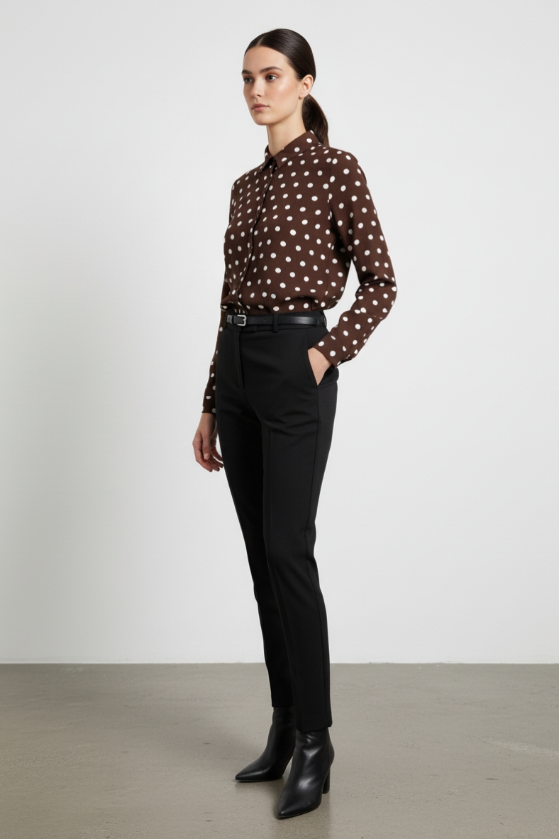 La stampa a pois, un classico intramontabile, aggiunge un tocco di vivacità e personalità al tuo outfit. Puoi abbinarla facilmente a un paio di pantaloni neri slim fit per un look professionale, oppure a una gonna midi per un’uscita serale con le amiche. Non dimenticare di completare il tuo look con un paio di stivaletti in pelle per un tocco di eleganza.