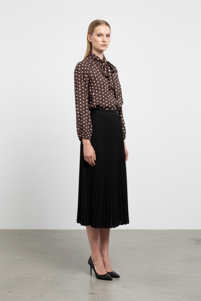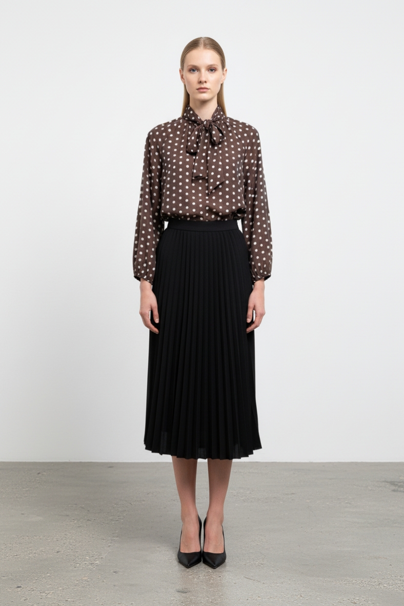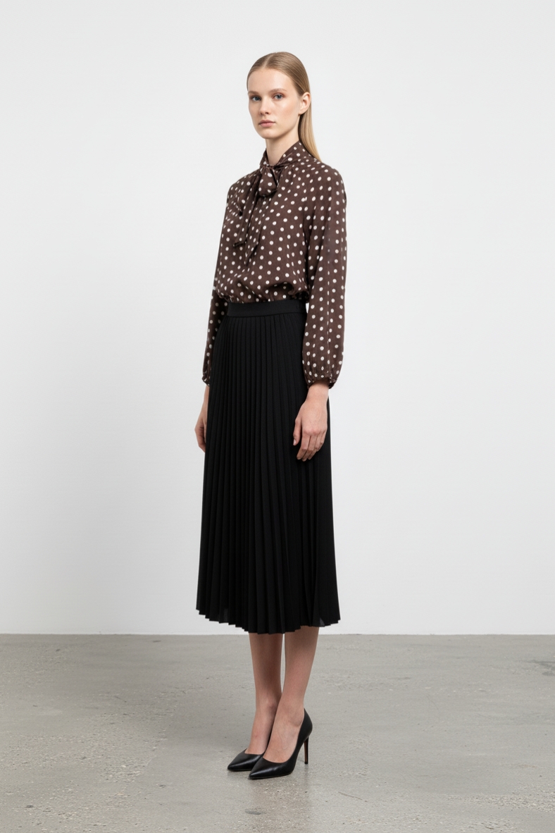 Per un outfit impeccabile, abbinala a una gonna plissettata nera e a un paio di décolleté eleganti. Questo abbinamento non solo esalta la bellezza della camicia, ma crea anche un contrasto affascinante tra i pois e la semplicità della gonna. Se desideri un look più casual, prova a indossarla con un paio di jeans skinny e stivaletti in pelle. Aggiungi un blazer per un tocco di classe in più.