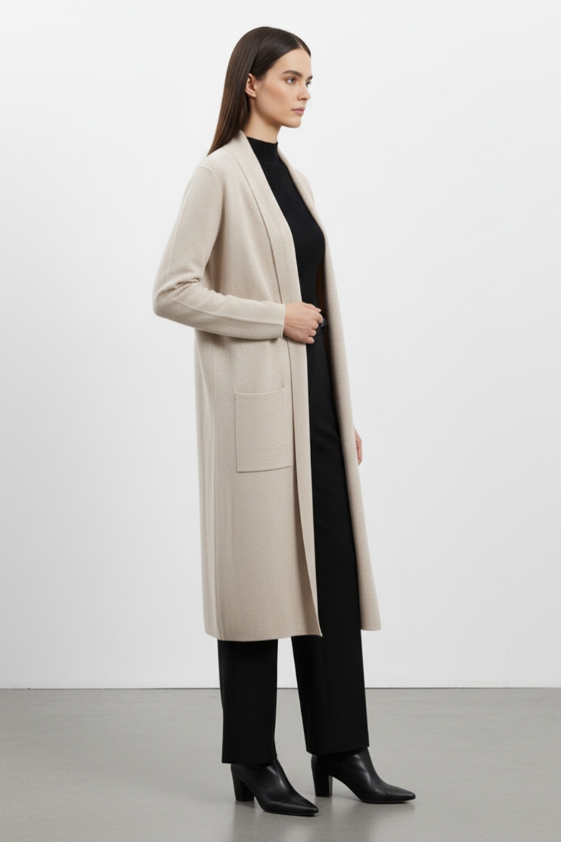 Puoi indossarlo sopra un maglione a collo alto per un look sofisticato, oppure abbinarlo a una semplice t-shirt e jeans per un’uscita informale. Le due tasche frontali aggiungono un tocco pratico e chic, mentre il taglio lungo slancia la figura, rendendolo adatto a qualsiasi silhouette.