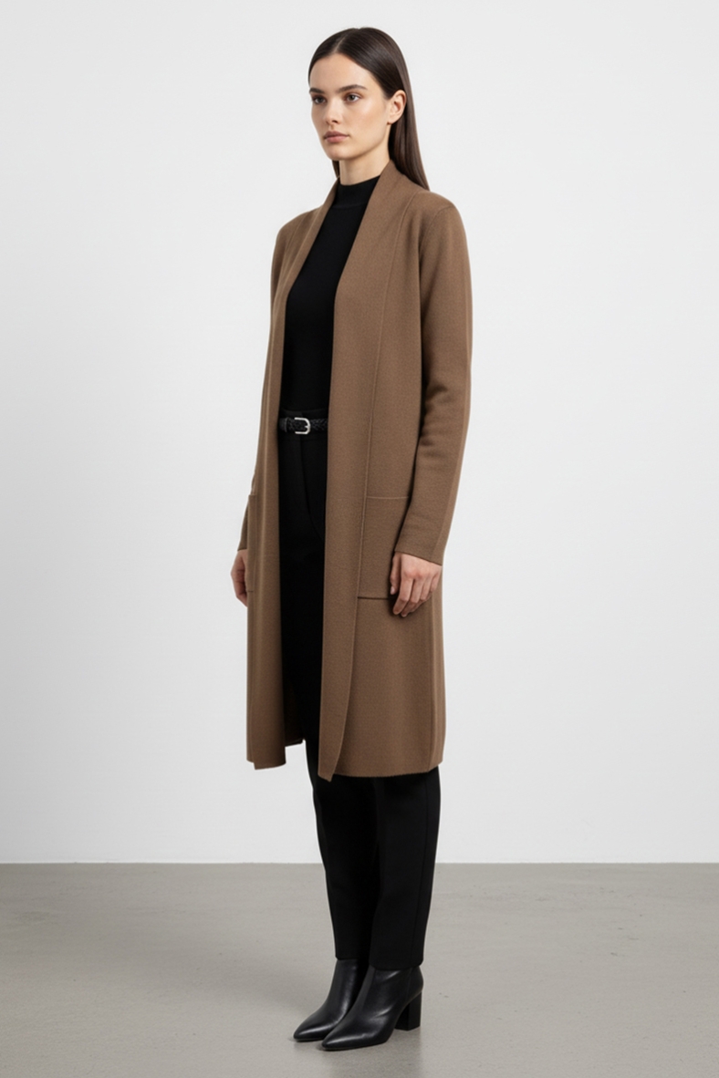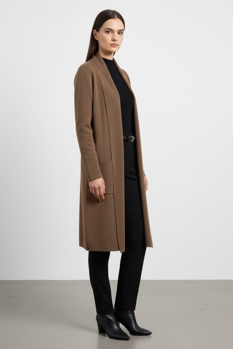 Il cardigan lungo in viscosa è un capo che non può mancare nel tuo guardaroba autunnale. Realizzato con una composizione di alta qualità, questo cardigan offre una sensazione di morbidezza e comfort sulla pelle, grazie alla viscosa che lo rende leggero e traspirante. La sua vestibilità elegante si adatta perfettamente a qualsiasi silhouette, mentre il design minimalista lo rende estremamente versatile. Puoi abbinarlo facilmente a una camicia bianca e pantaloni neri per un look da ufficio impeccabile, oppure indossarlo sopra un abito per una serata elegante. Le tasche laterali aggiungono un tocco pratico e chic, perfette per riporre piccoli oggetti. Completa il tuo outfit con stivali in pelle e una cintura in vita per accentuare la silhouette. Questo cardigan è l’ideale per le giornate più fresche, offrendo calore senza compromettere lo stile. Scegli il cardigan lungo in viscosa per un look sofisticato e alla moda, perfetto per ogni occasione.