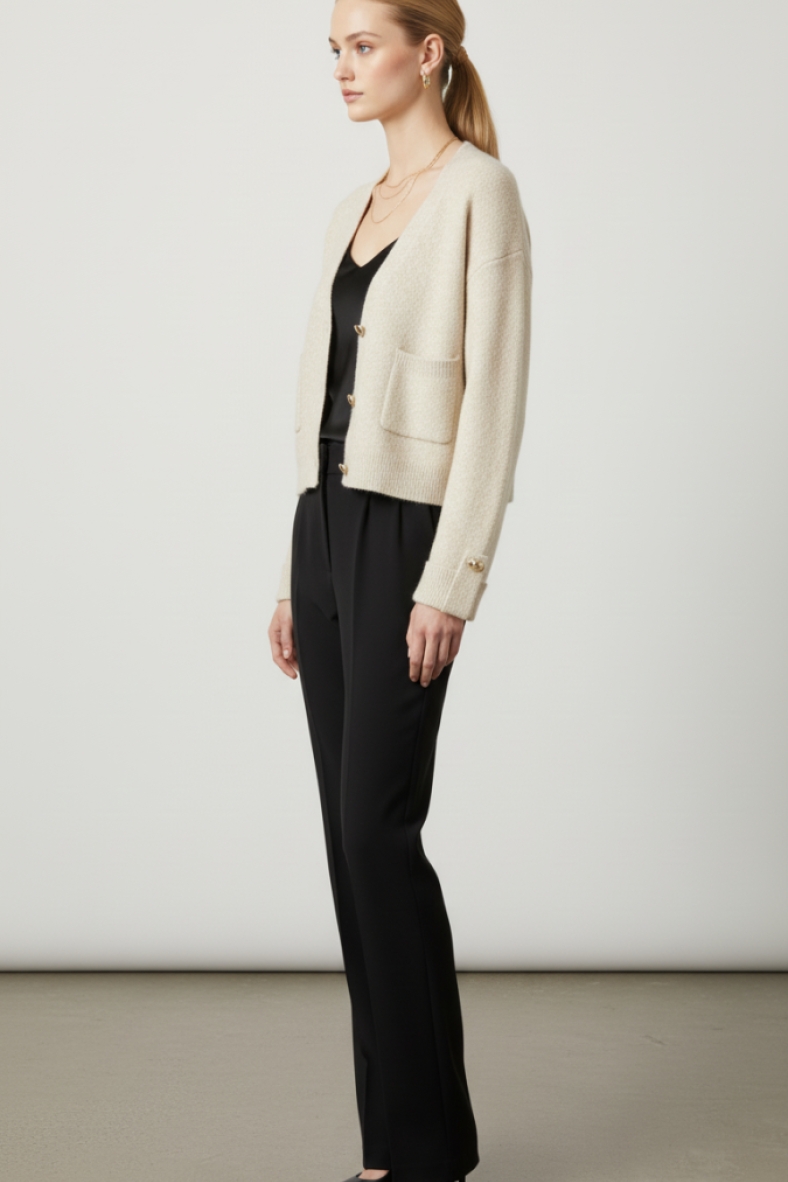 Perfetto da abbinare a una camicia bianca e a un paio di pantaloni neri per un look da ufficio impeccabile, questo cardigan può anche essere indossato sopra un abito elegante per una serata speciale. Non dimenticare di completare il tuo outfit con accessori minimalisti, come orecchini a cerchio e una borsa a tracolla, per un tocco di classe.