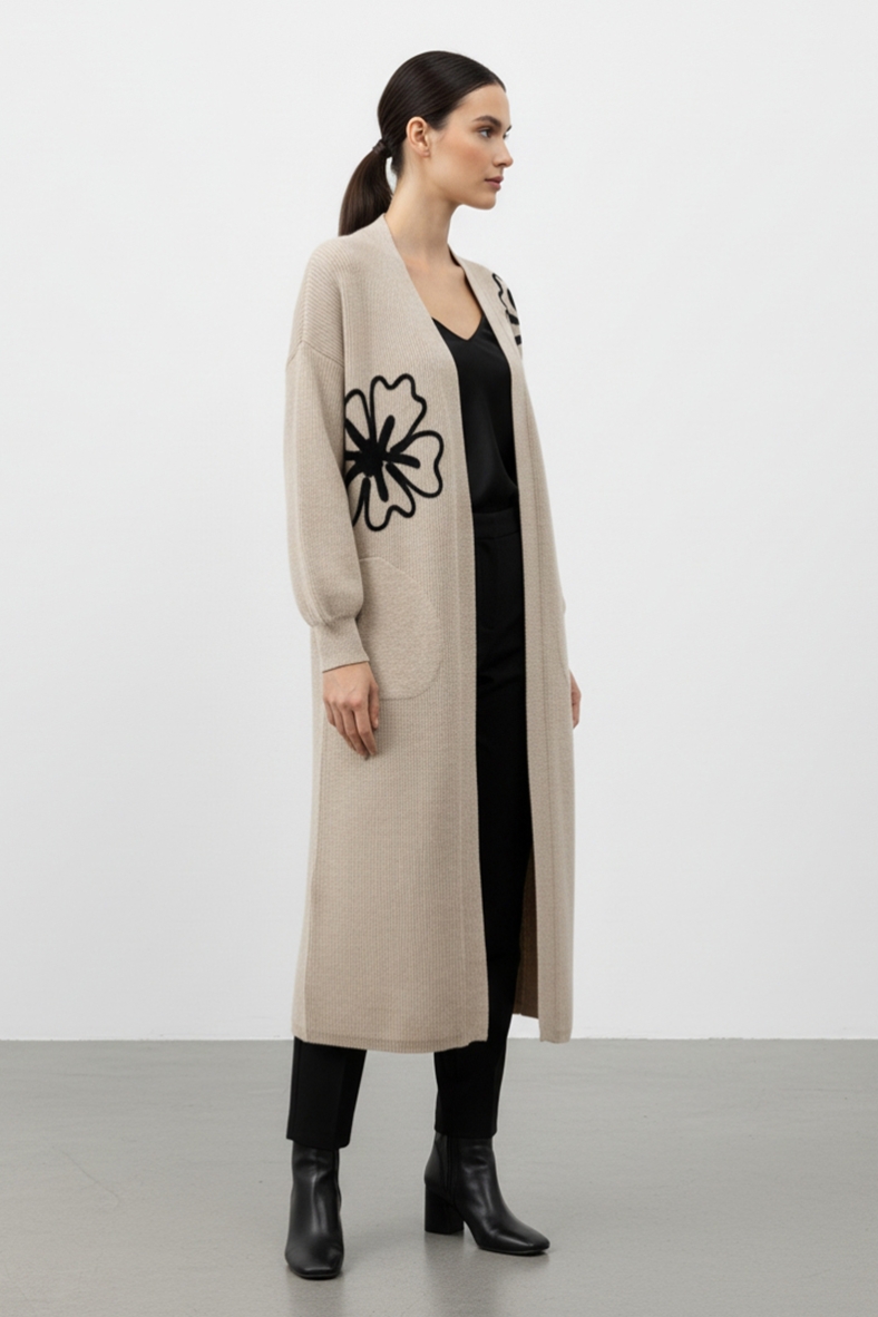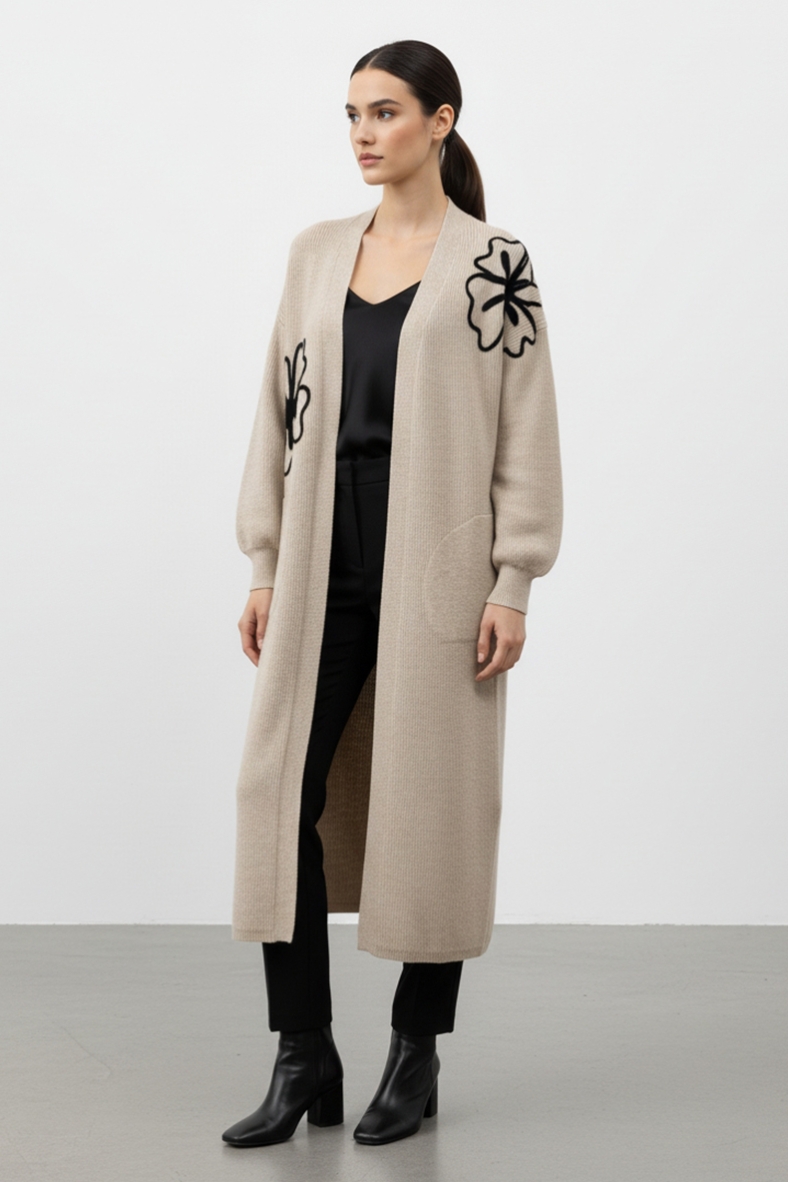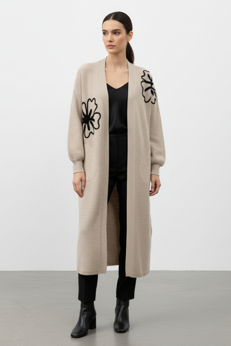 La sua tonalità neutra lo rende facilmente abbinabile a qualsiasi colore, permettendoti di giocare con accessori e scarpe. Non dimenticare di aggiungere una sciarpa in cashmere per un ulteriore tocco di eleganza. Scegli il cardigan lungo con fiori per un look che unisce comfort e stile, e preparati a ricevere complimenti!