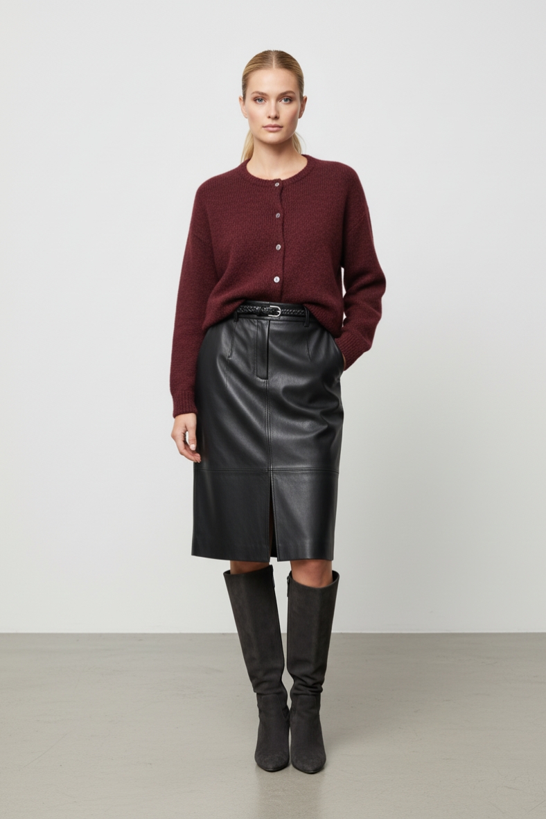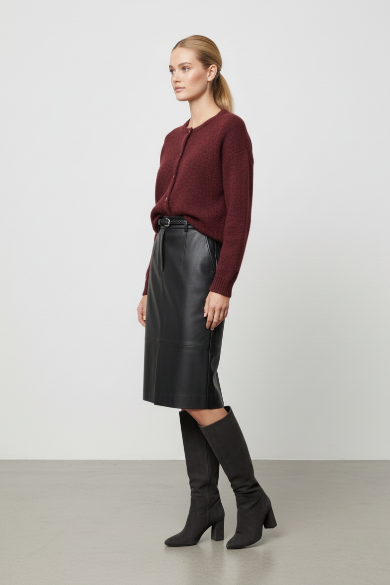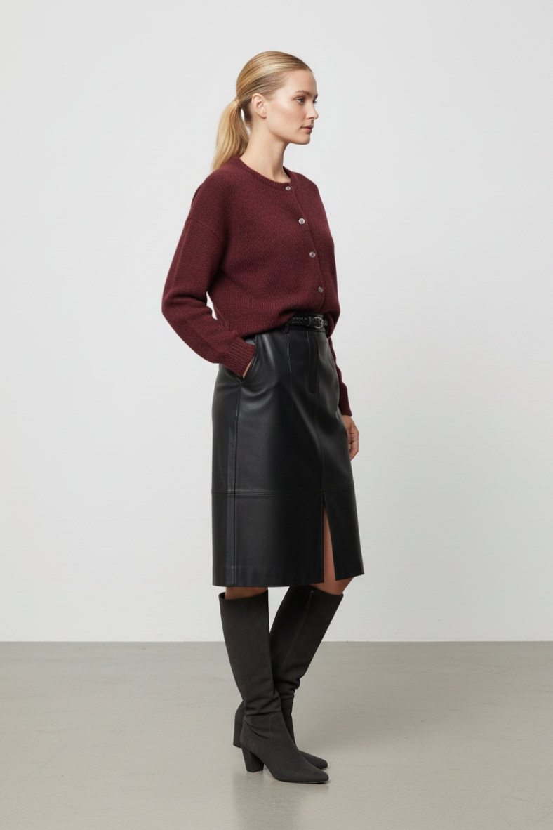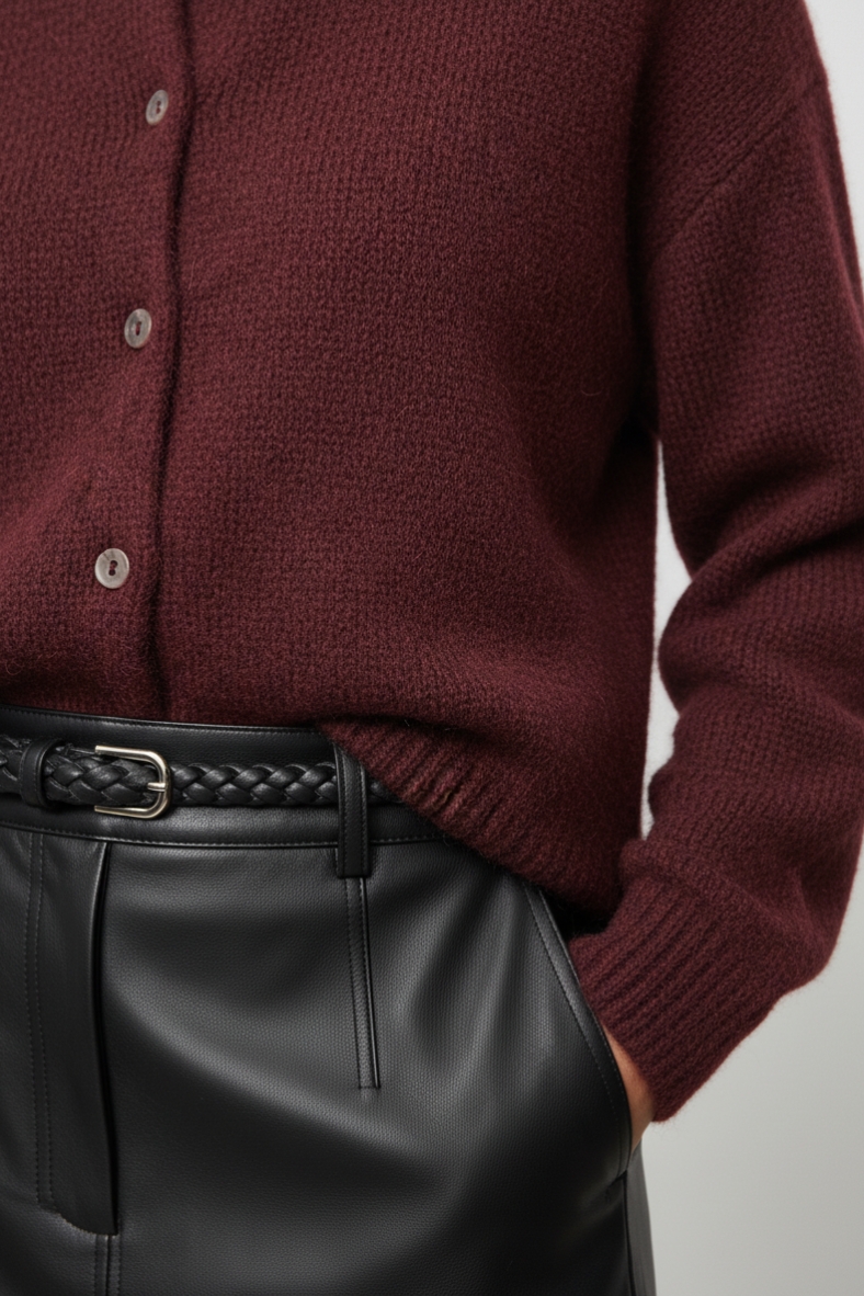 I bottoni raffinati lungo la parte anteriore aggiungono un tocco di classe, mentre il colore bordeaux si sposa perfettamente con una varietà di tonalità, rendendolo facile da abbinare. Per un look sofisticato, prova a indossarlo sopra una camicia bianca e abbinalo a pantaloni eleganti in tessuto grigio. Completa il tuo outfit con stivaletti in pelle nera per un tocco di modernità.