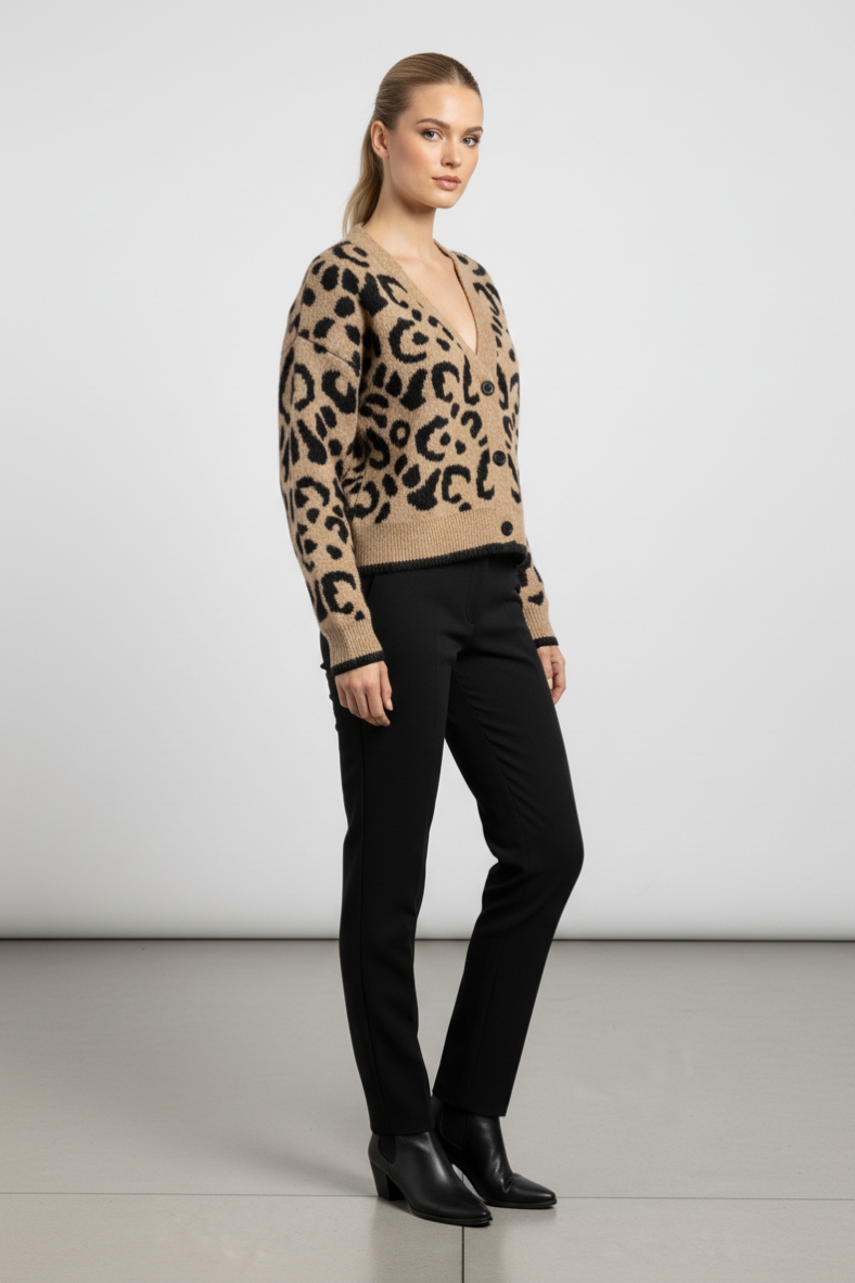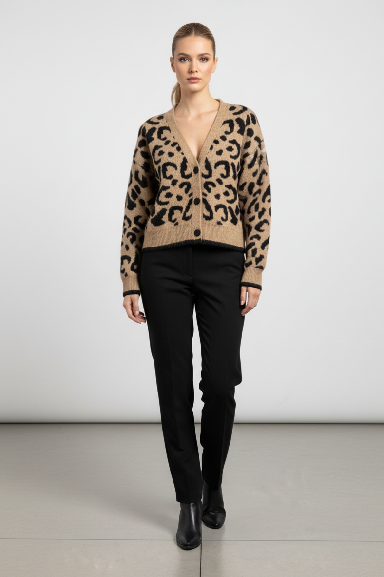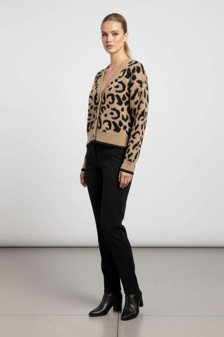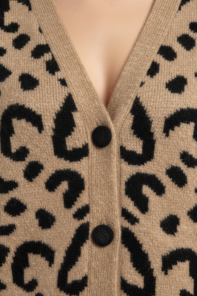 Il cardigan leopardato chic è il must-have della stagione. Con il suo design elegante e il mix di materiali, è perfetto per ogni outfit, dal casual all'elegante.