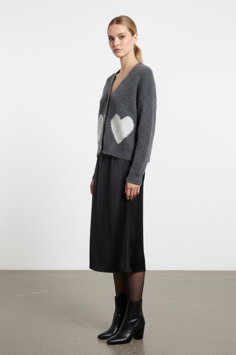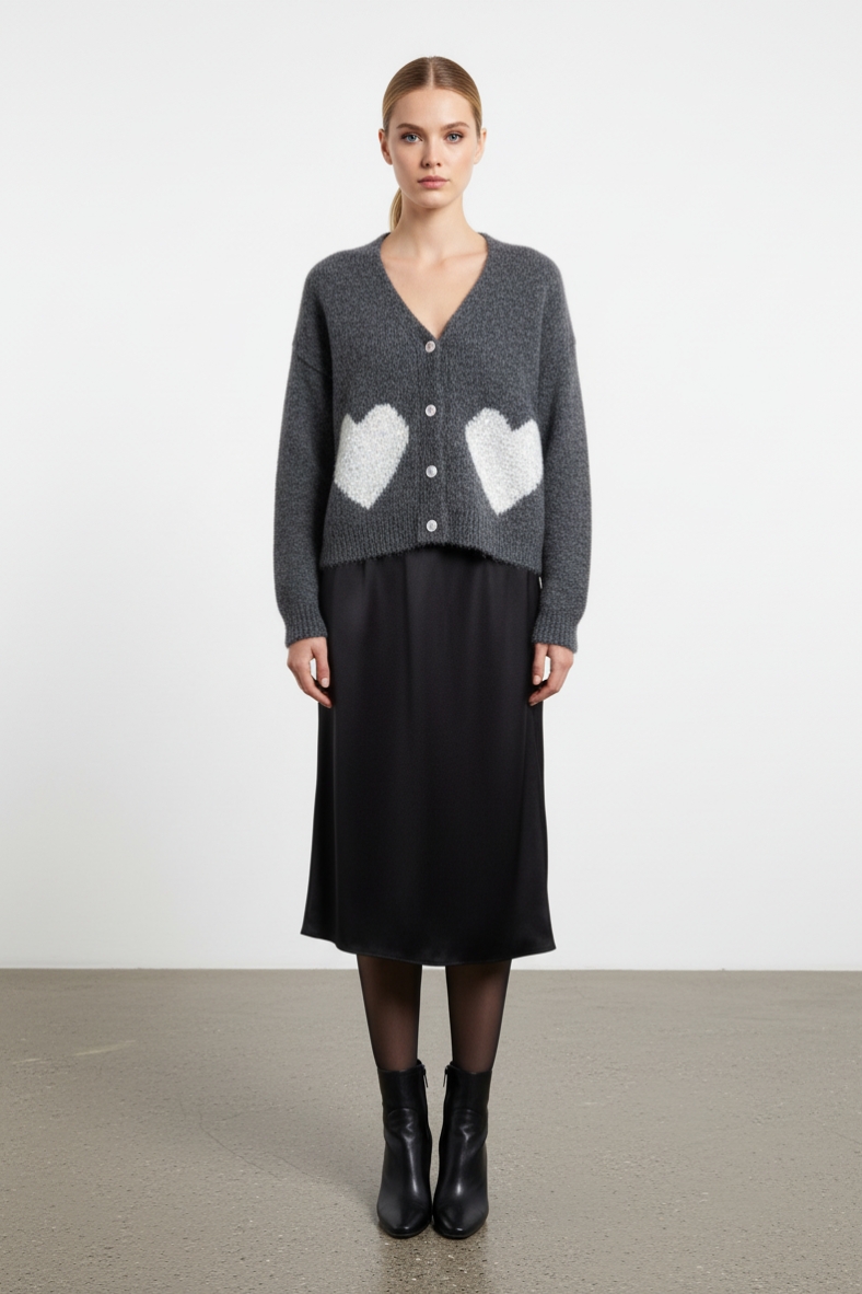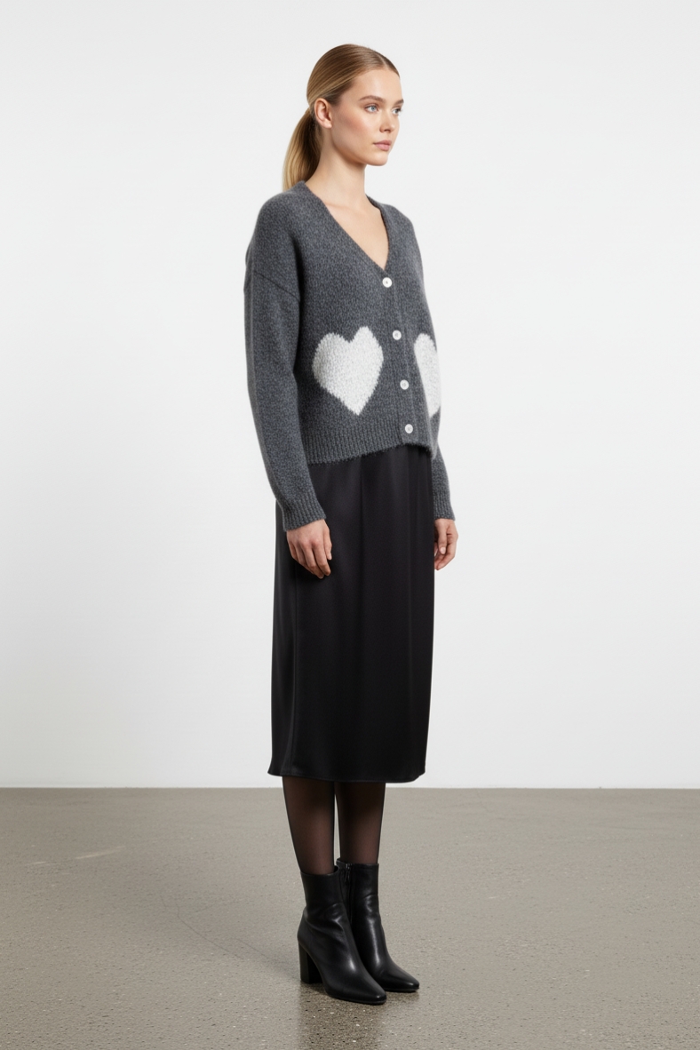 Non dimenticare di completare il tuo look con accessori minimalisti, come orecchini a cerchio e una borsa a tracolla. Con il cardigan con cuori in maglia, ogni tuo outfit sarà un’espressione di stile e personalità, perfetto per ogni occasione.