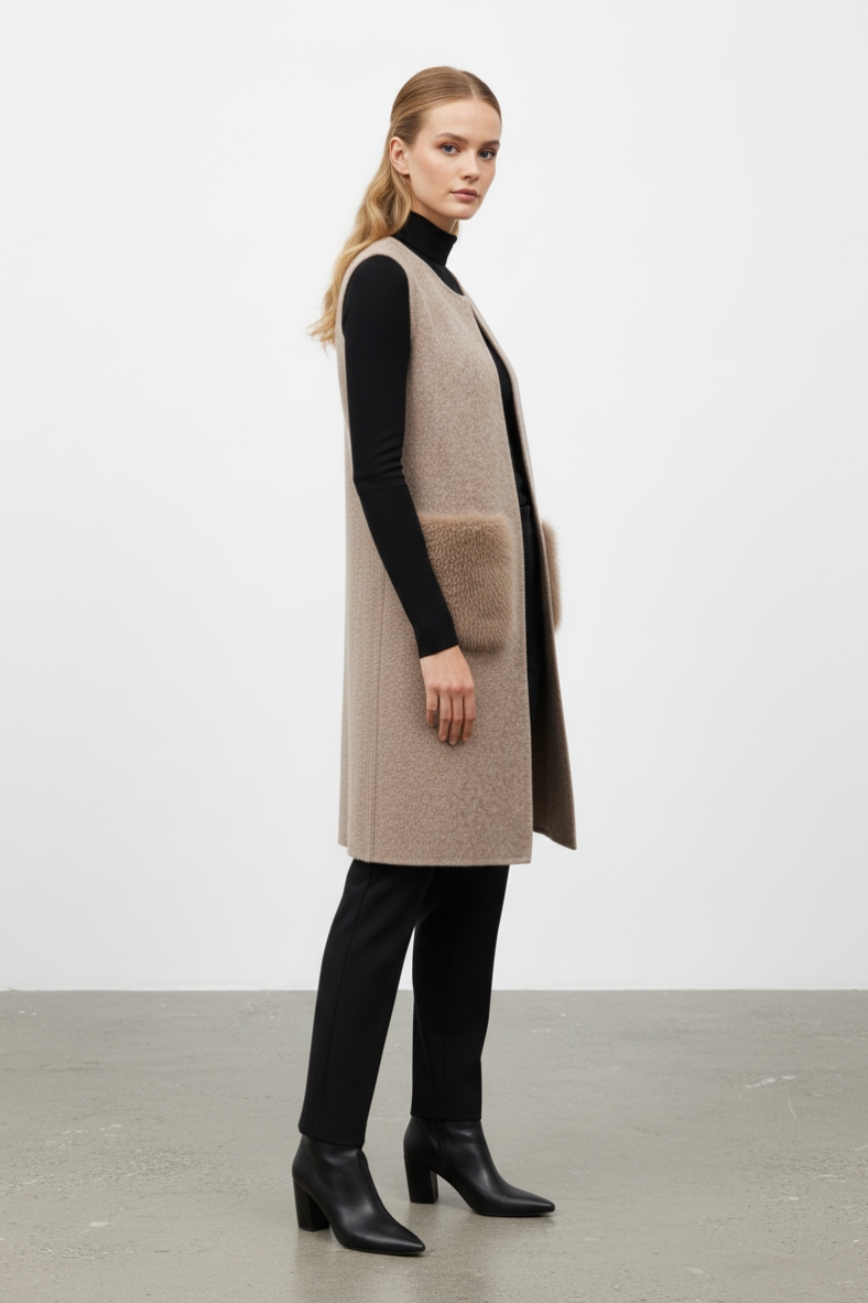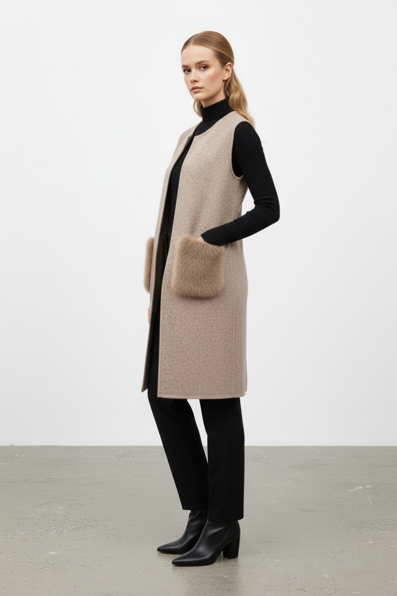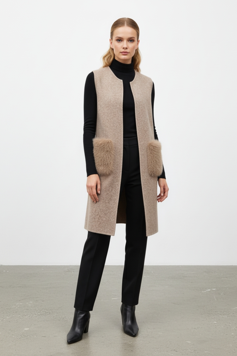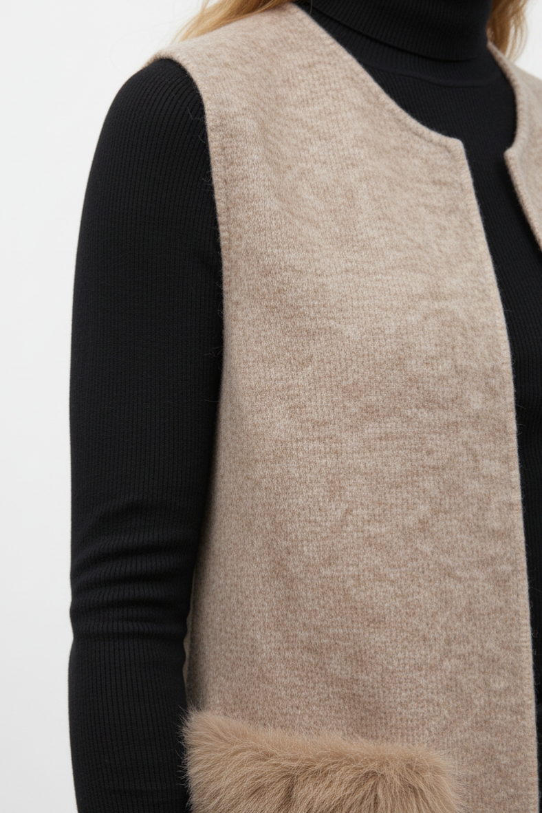 Il cardigan smanicato con tasche in pelliccia è un must-have per la stagione fredda. Realizzato in un mix di materiali di alta qualità, offre calore e stile in ogni occasione.
