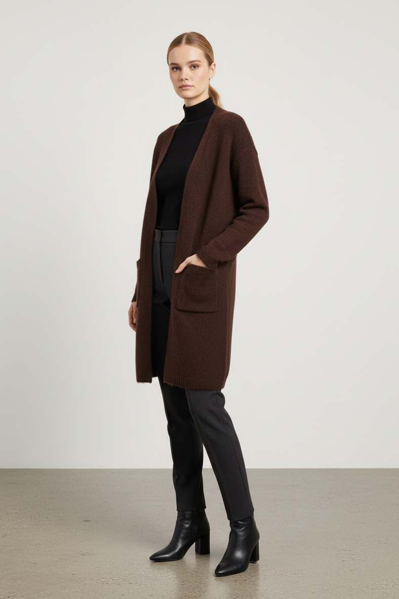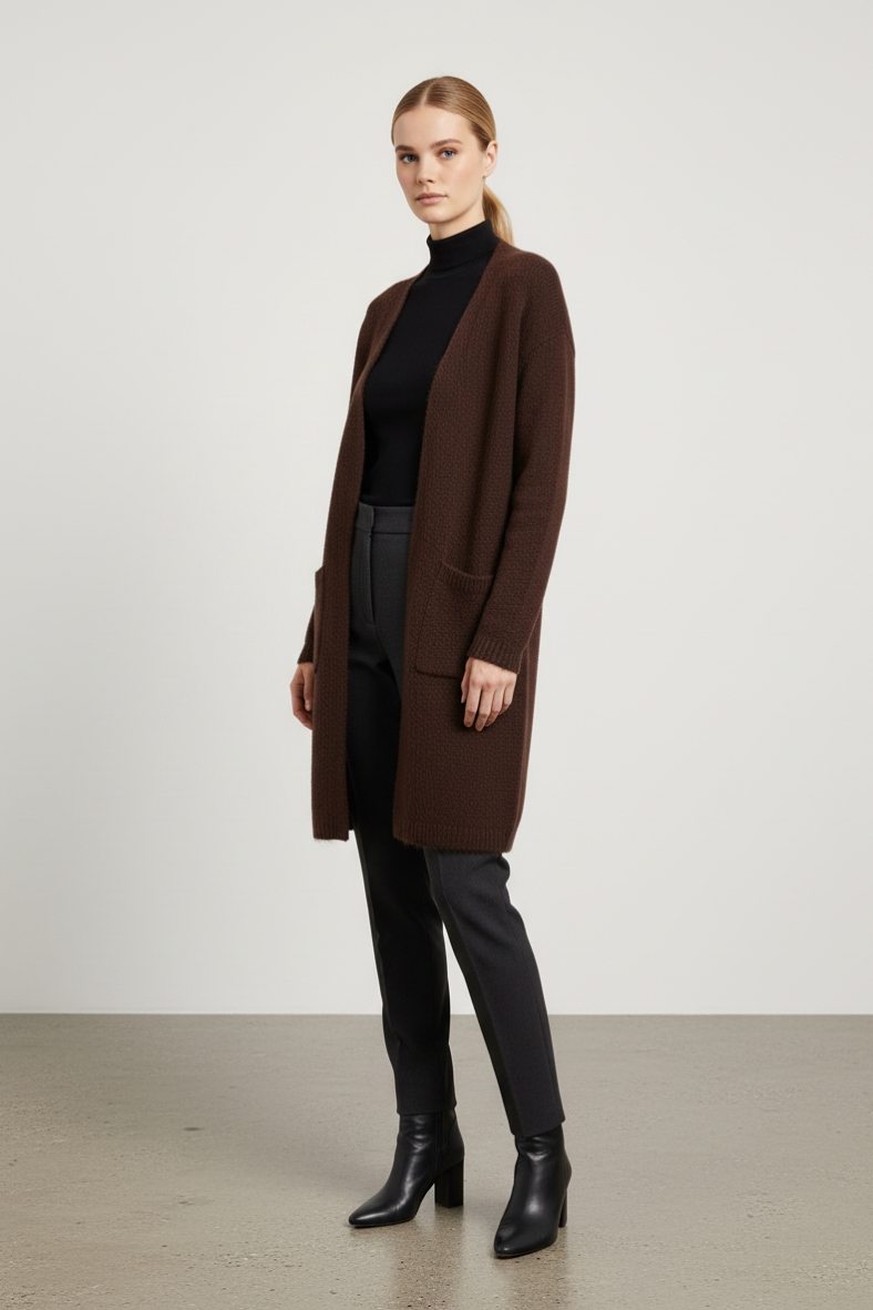 Il cardigan lungo con tasche è un must-have per il tuo guardaroba autunnale. Realizzato con una miscela di lana, offre comfort e stile in ogni occasione.