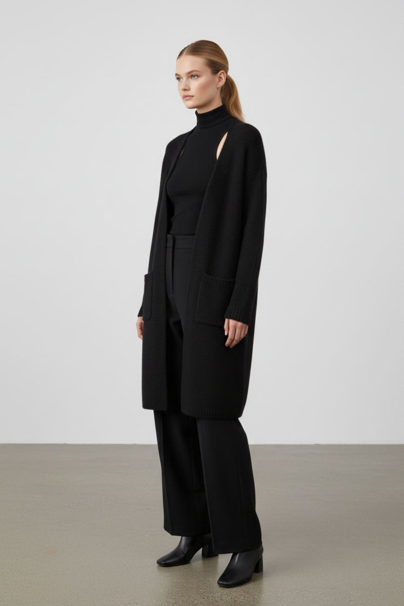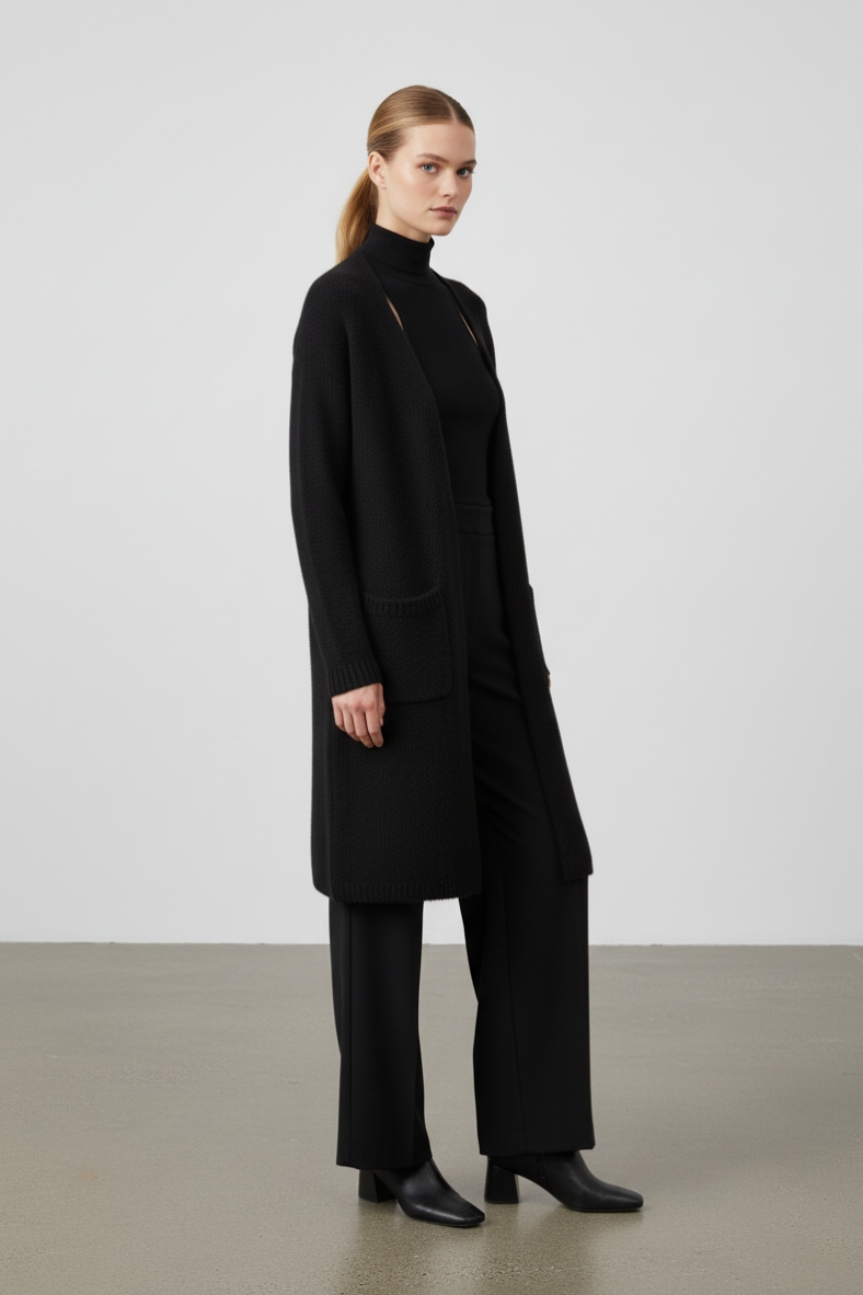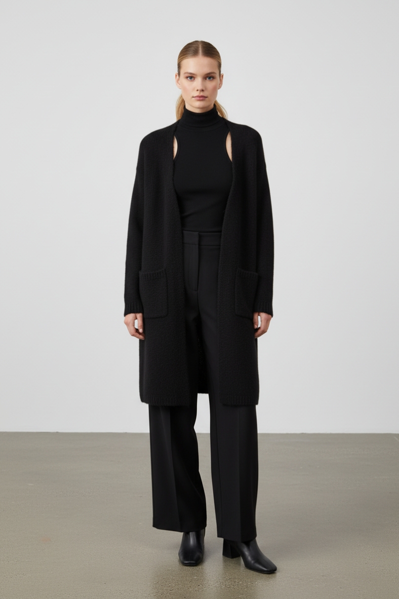 Il cardigan lungo con tasche è un must-have per il tuo guardaroba autunnale. Realizzato con una miscela di lana, offre comfort e stile in ogni occasione.