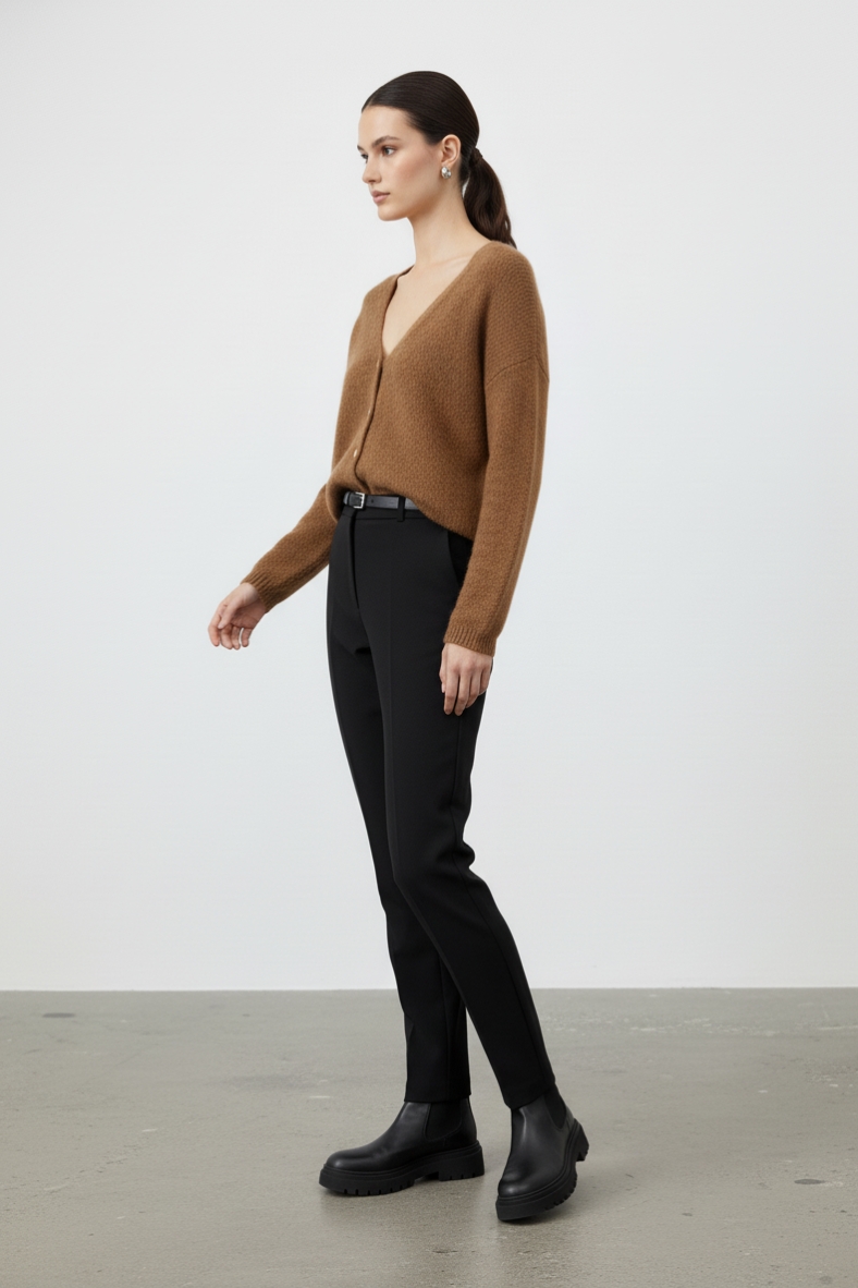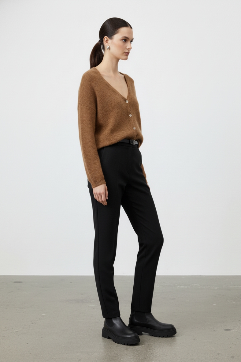 Per un outfit impeccabile, abbinalo a pantaloni a palazzo in tessuto, che creano un contrasto elegante e sofisticato. Completa il look con stivaletti in pelle nera per un tocco di raffinatezza. Questo cardigan è ideale anche per un look casual-chic, indossato sopra un abito midi con stivali alti. Non dimenticare di accessoriare con una sciarpa in cashmere per un ulteriore tocco di lusso. Sia che tu stia andando in ufficio o a un brunch con le amiche, il cardigan morbido con bottoni sarà il tuo alleato di stile per tutta la stagione.