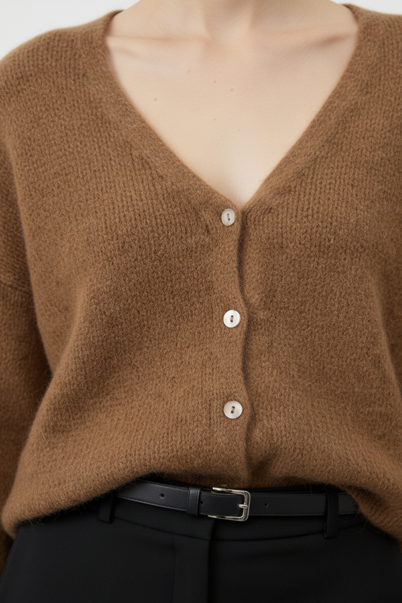 Il cardigan morbido con bottoni è l'aggiunta perfetta al tuo guardaroba invernale. Realizzato con una miscela di mohair e lana, offre calore e comfort senza rinunciare allo stile.