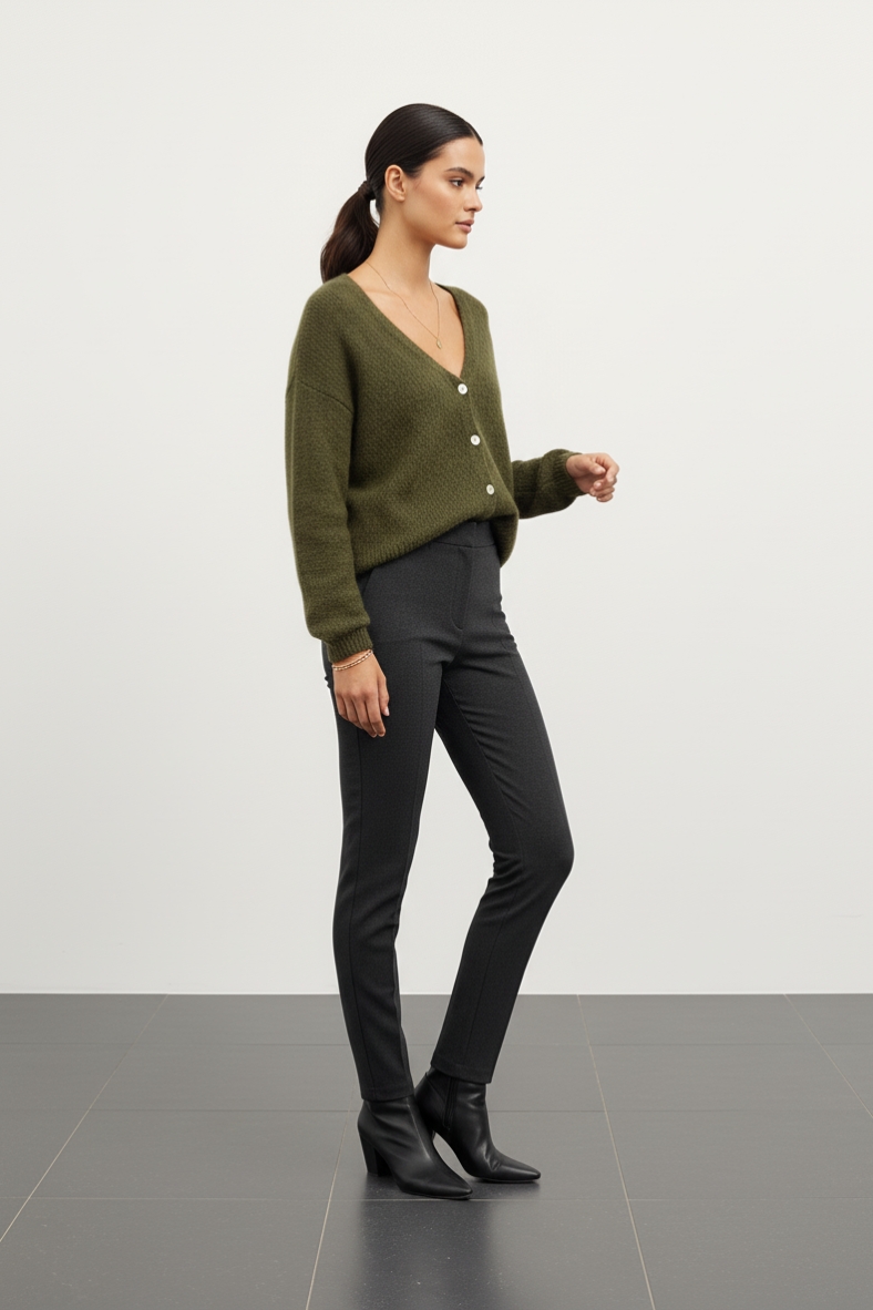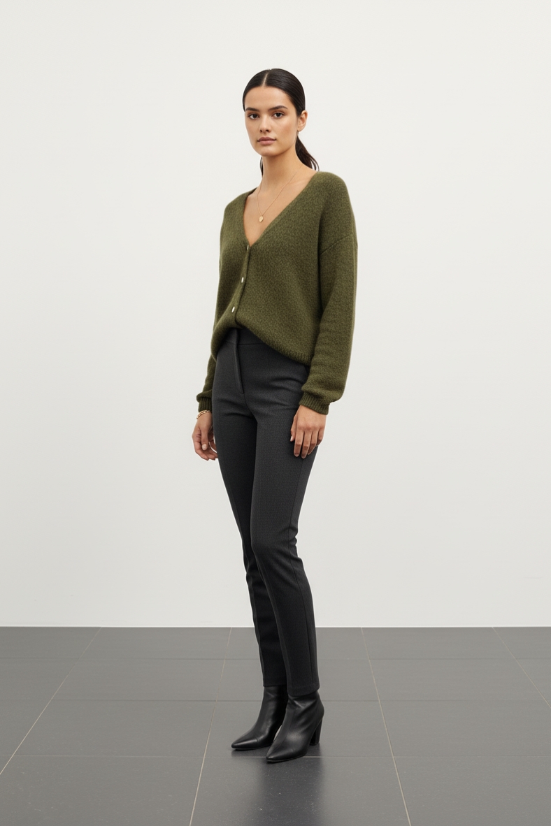 Per un outfit impeccabile, abbinalo a pantaloni a palazzo in tessuto, che creano un contrasto elegante e sofisticato. Completa il look con stivaletti in pelle nera per un tocco di raffinatezza. Questo cardigan è ideale anche per un look casual-chic, indossato sopra un abito midi con stivali alti. Non dimenticare di accessoriare con una sciarpa in cashmere per un ulteriore tocco di lusso. Sia che tu stia andando in ufficio o a un brunch con le amiche, il cardigan morbido con bottoni sarà il tuo alleato di stile per tutta la stagione.