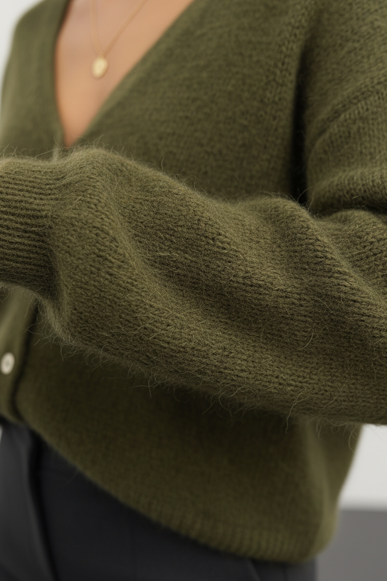 Il cardigan morbido con bottoni è l'aggiunta perfetta al tuo guardaroba invernale. Realizzato con una miscela di mohair e lana, offre calore e comfort senza rinunciare allo stile.