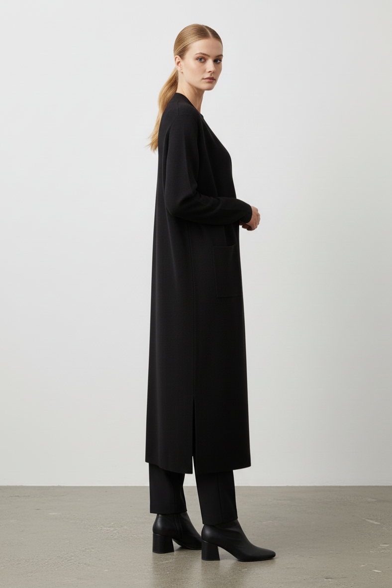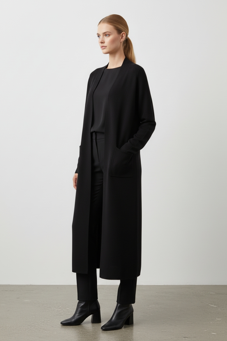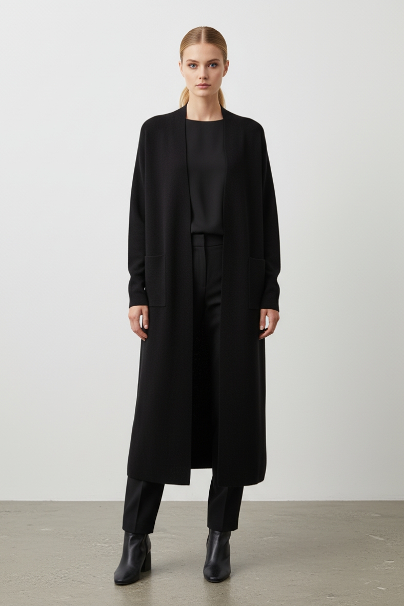 Non dimenticare di accessoriare il tuo look con una sciarpa in cashmere o una borsa in pelle per un tocco di eleganza. Con il cardigan lungo con tasche, ogni outfit diventa un’affermazione di stile, combinando comfort e raffinatezza in un solo capo.