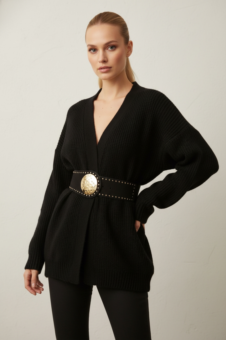 Questa cintura non è solo un accessorio, ma un vero e proprio alleato di stile. Scegli di indossarla in vita per un effetto snellente, oppure lasciala cadere sui fianchi per un look più rilassato. In ogni caso, la cintura nera con fibbia dorata saprà come farti sentire sicura e alla moda, rendendo ogni tuo outfit unico e ricercato.