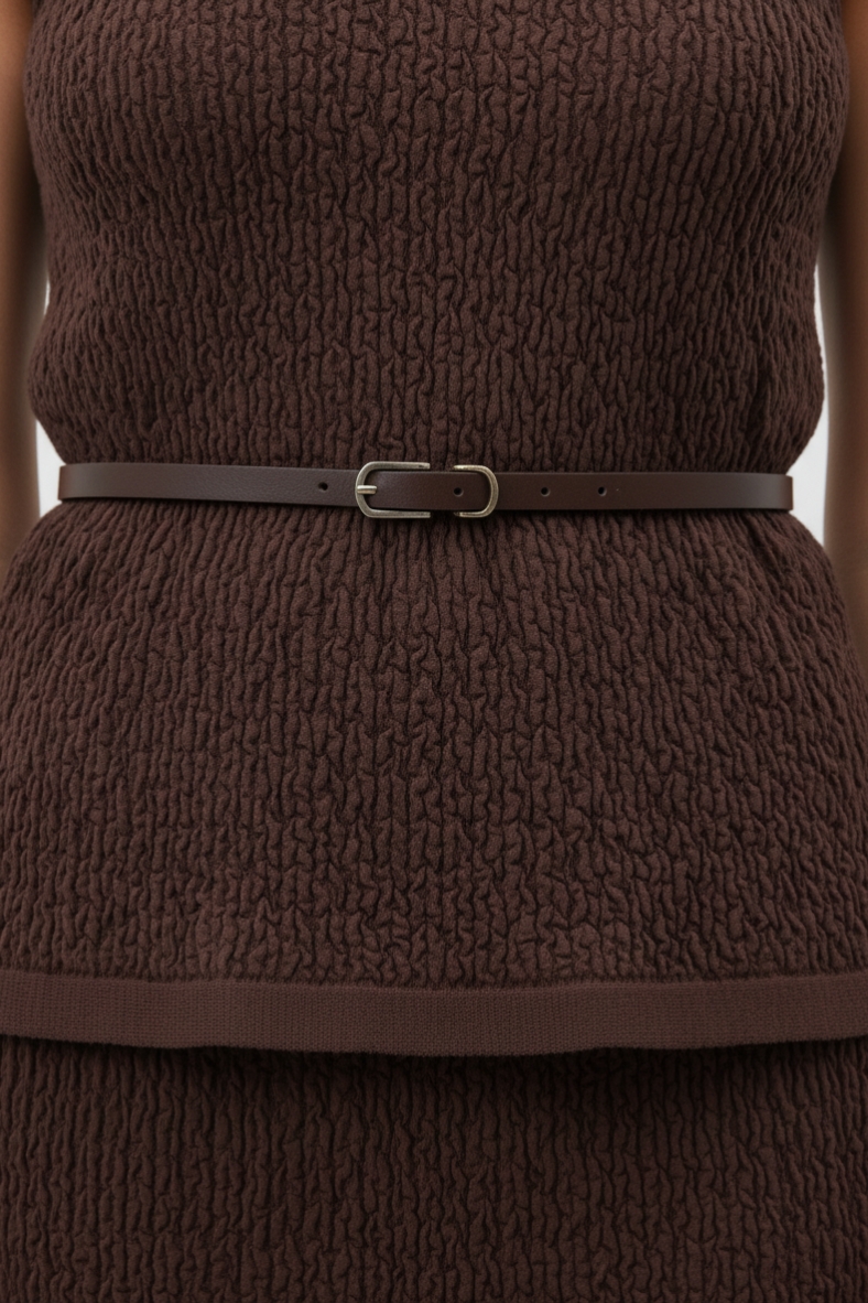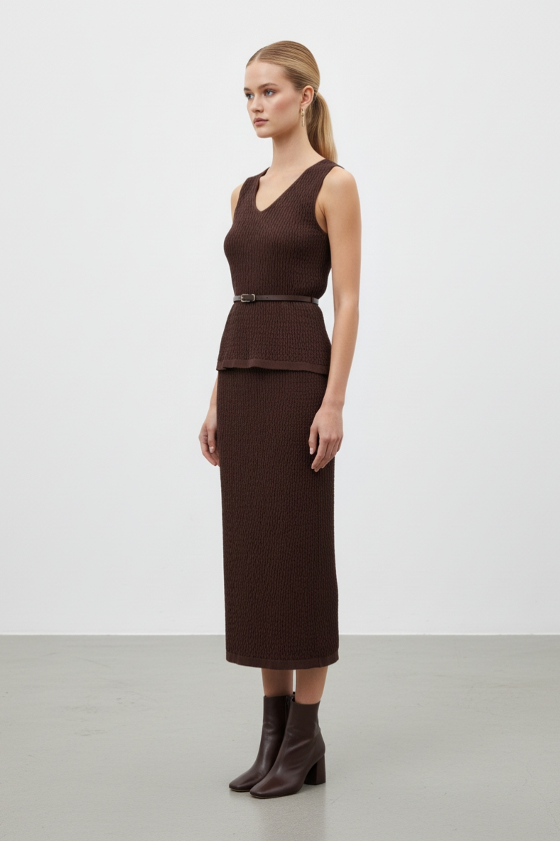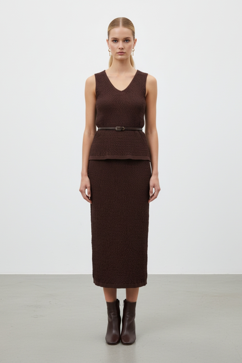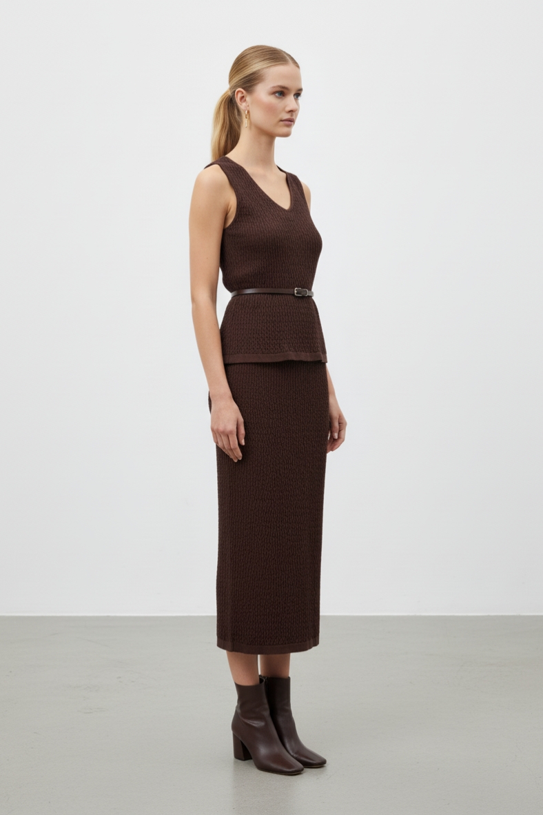 Il completo midi con cintura è un must-have per la stagione autunnale. Realizzato in morbida viscosa, questo capo offre una vestibilità impeccabile e un comfort senza pari. La sua tonalità marrone scuro è perfetta per abbinamenti eleganti e casual, rendendolo un pezzo versatile nel tuo guardaroba. La cintura in vita non solo definisce la silhouette, ma aggiunge anche un tocco di raffinatezza al look.