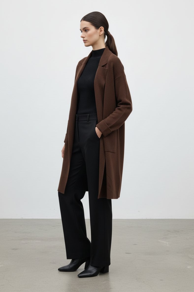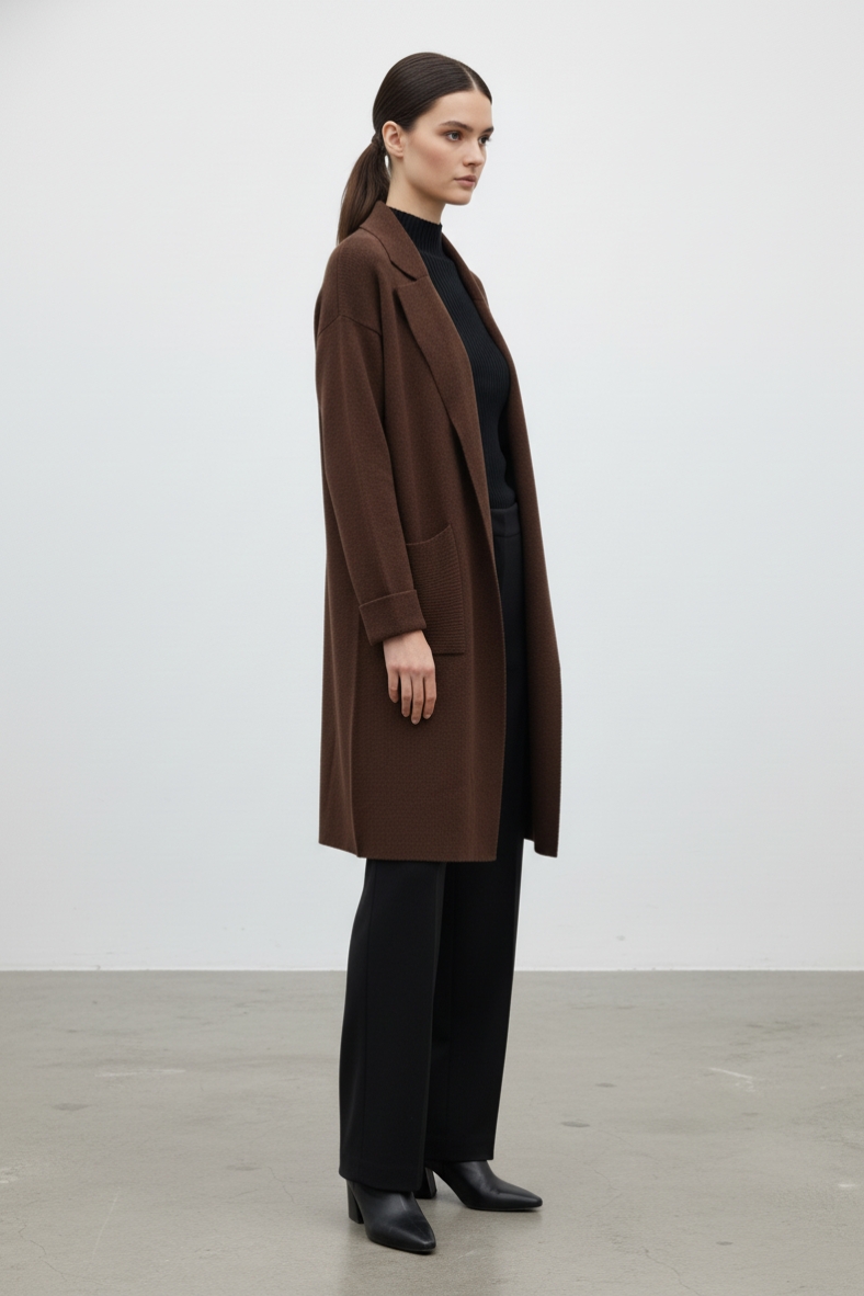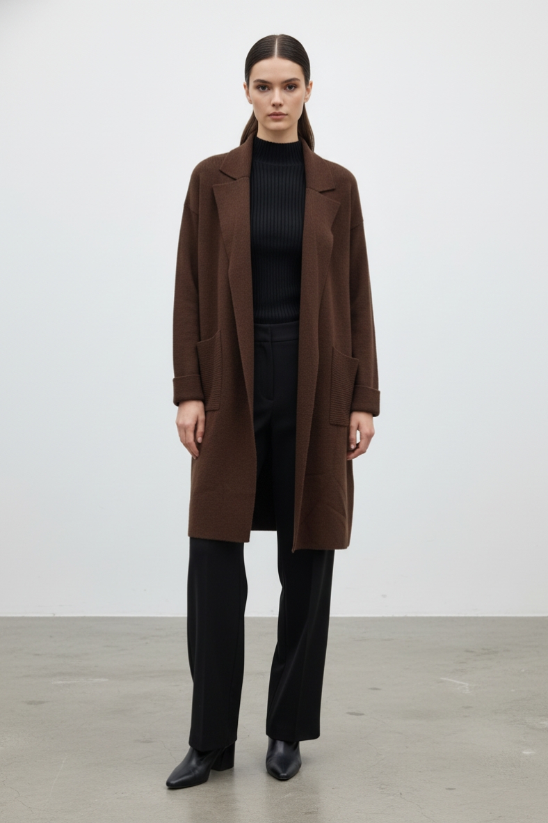 Il cappotto in maglia con tasche è l'alleato ideale per affrontare le giornate più fredde con eleganza. Realizzato con una miscela di materiali di alta qualità, offre calore e comfort senza compromettere lo stile.