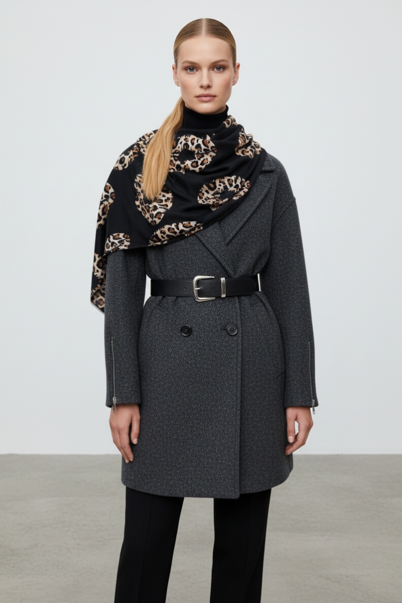 Puoi abbinarlo a un cappotto oversize grigio, come quello mostrato in foto, per un look chic e contemporaneo. Indossalo avvolto attorno al collo o lasciato cadere sulle spalle per un effetto drammatico. Per un tocco di eleganza in più, prova a fissarlo con una cintura in vita, creando un contrasto affascinante tra il rigore del cappotto e la morbidezza del foulard.