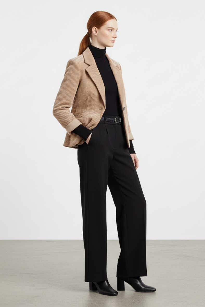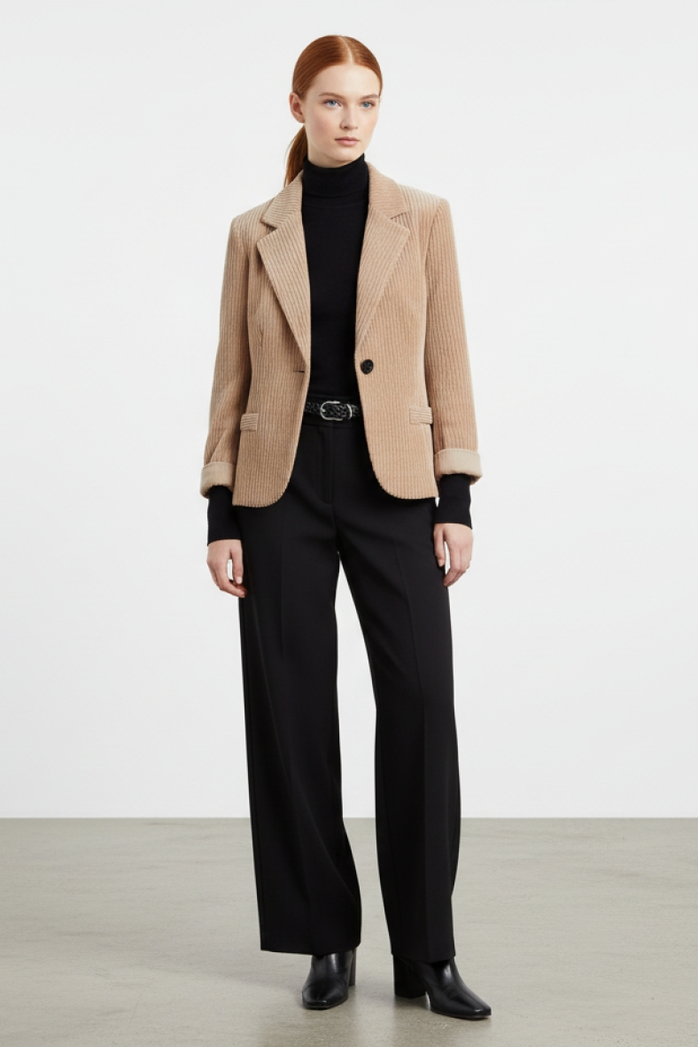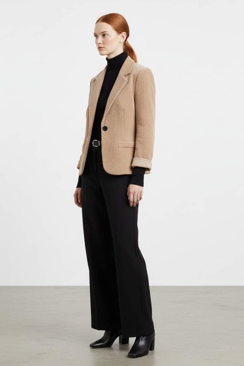 Questa giacca a costine effetto velluto è ideale da abbinare a un pantalone palazzo nero per un look sofisticato da ufficio, oppure a una gonna midi per un’uscita serale. Scegli un dolcevita sottile sotto per un effetto chic e accogliente, e completa il tuo outfit con stivali in pelle per un tocco di classe. La tonalità neutra della giacca la rende estremamente versatile, permettendoti di giocare con accessori colorati o con un foulard in seta per un contrasto elegante.