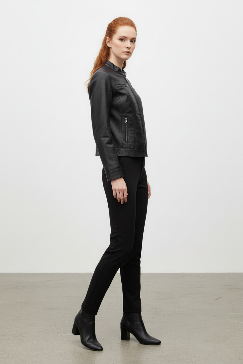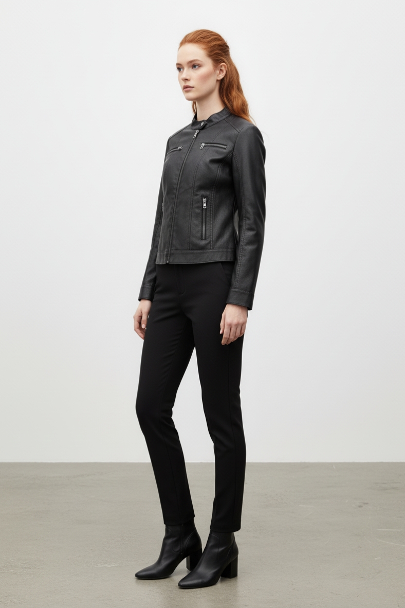La giacca in pelle slim fit è un capo essenziale per chi desidera unire stile e funzionalità. Realizzata con un mix di materiali di alta qualità, questa giacca presenta una silhouette aderente che valorizza la figura femminile. I dettagli come le zip decorative e le tasche laterali aggiungono un tocco di modernità, rendendola perfetta per un look urbano e contemporaneo.