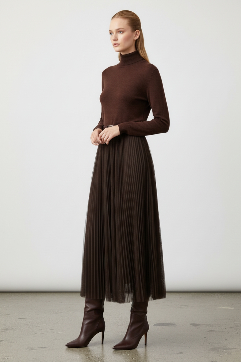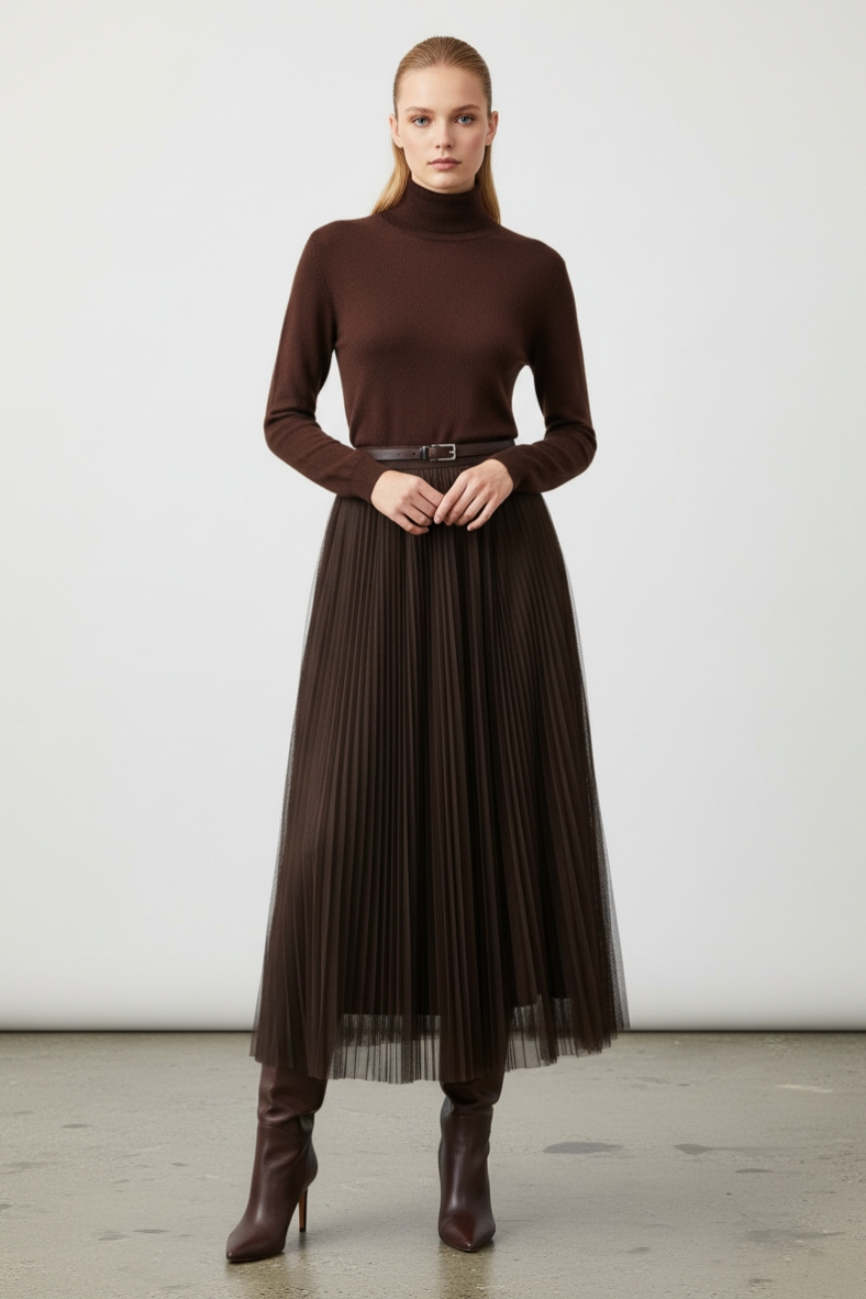 La gonna plissettata in tulle è il capo perfetto per chi desidera unire comfort e stile. Realizzata in poliestere di alta qualità, questa gonna presenta una silhouette fluida e leggera, che si muove con grazia ad ogni passo. La sua lunghezza midi la rende versatile, adatta sia per un look da ufficio che per una serata speciale. Puoi abbinarla a un maglione a collo alto per un outfit chic e caldo, oppure optare per una camicia in seta per un tocco di eleganza. Gli stivali alti, come quelli in pelle, completano il look, slanciando la figura e aggiungendo un tocco di sofisticatezza. Non dimenticare di accessorize con una cintura in vita per definire la silhouette e dare un ulteriore tocco di stile. Questa gonna è perfetta anche per essere indossata con una giacca in pelle, per un contrasto di materiali che non passa inosservato. Scegli la gonna midi plissettata elegante per un guardaroba che parla di te e del tuo stile unico.