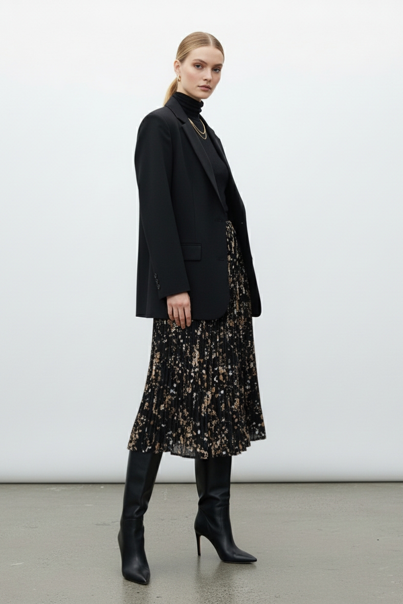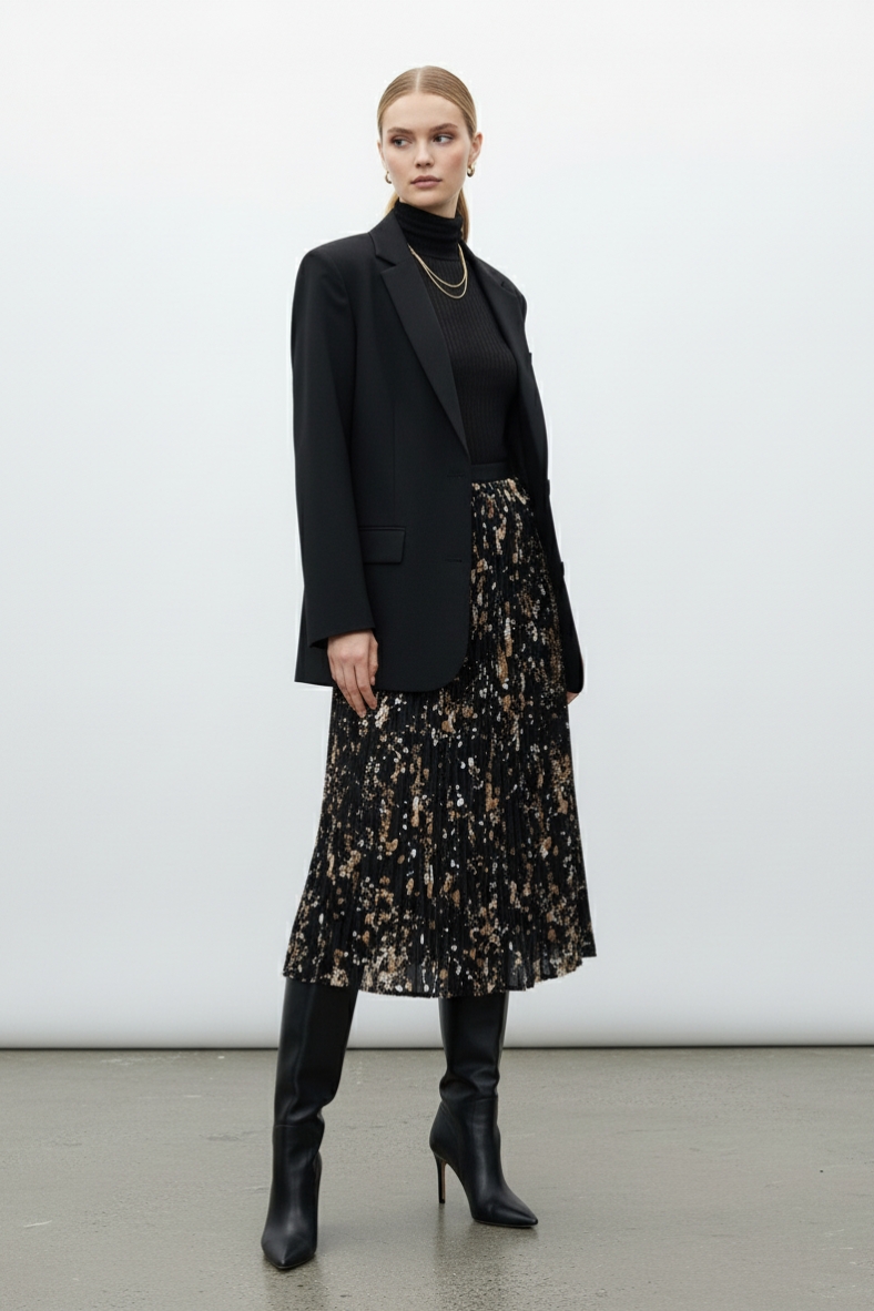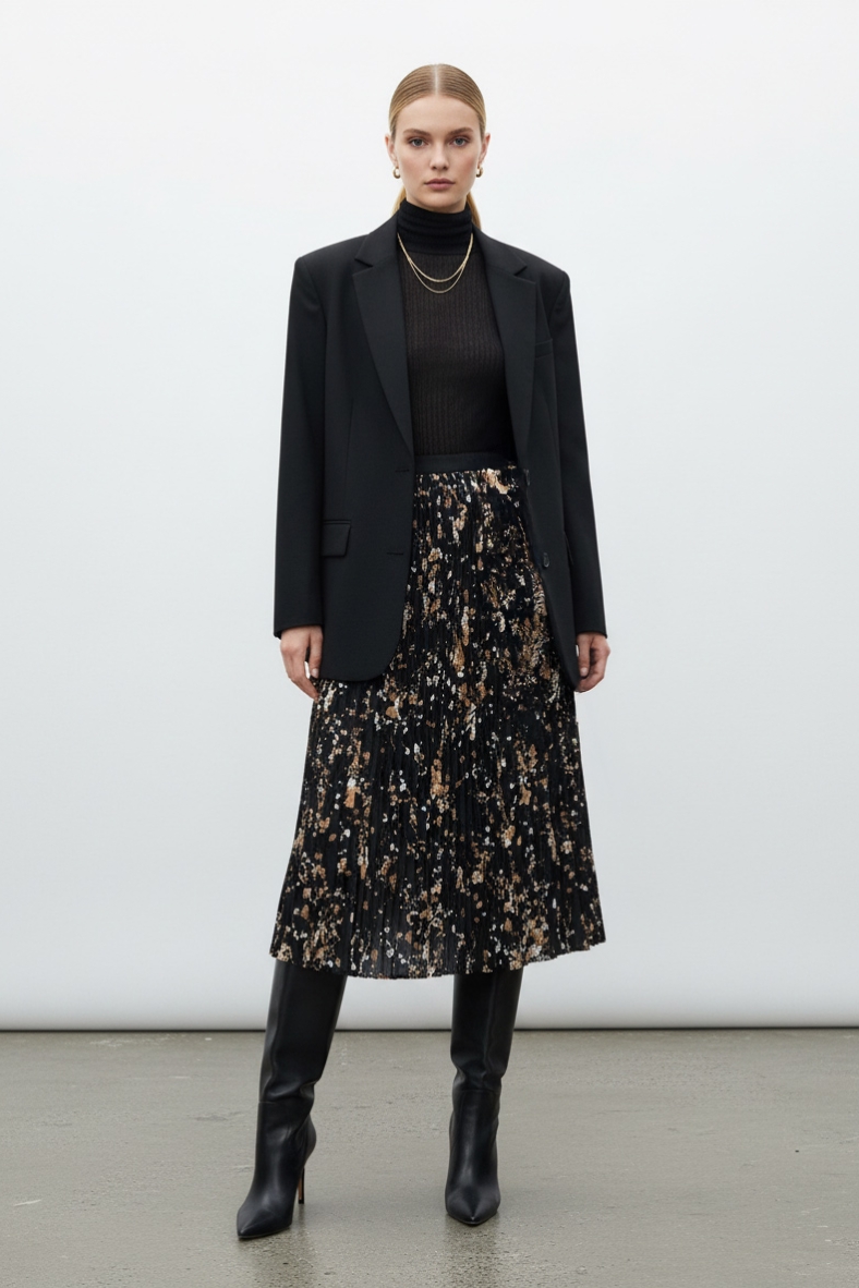 La gonna plissettata con fantasia floreale è il capo che non può mancare nel tuo guardaroba autunnale. Caratterizzata da un design elegante e sofisticato, questa gonna è perfetta per creare look versatili, dal casual all’elegante. La sua vestibilità fluida e il movimento dei plissè la rendono ideale per ogni occasione, sia per una giornata in ufficio che per una serata fuori.