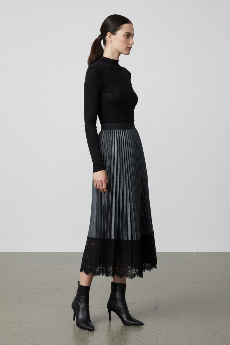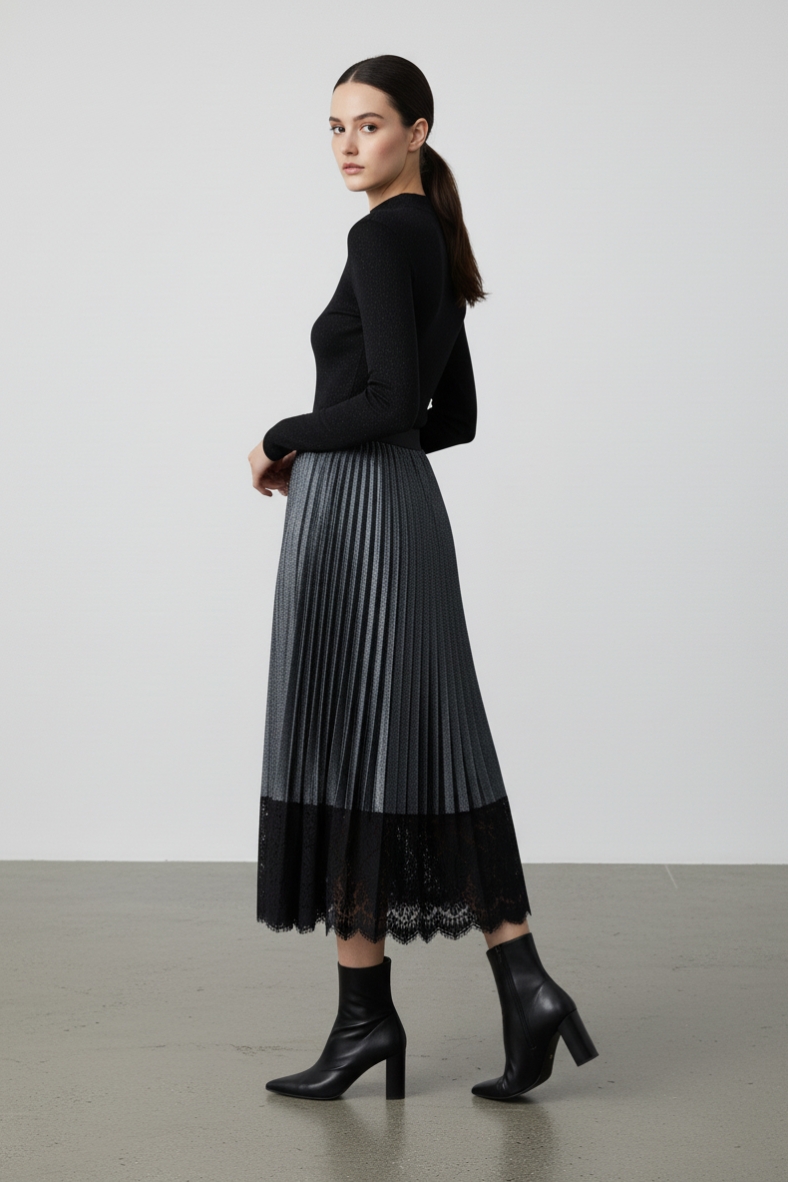 Per un look impeccabile, abbinala a un maglione aderente in cashmere o a una camicia elegante, completando il tutto con un paio di stivali alti in pelle. Se desideri un outfit da sera, prova a indossarla con una blusa in seta e accessori dorati per un effetto luminoso e sofisticato. Non dimenticare di aggiungere una giacca in pelle per un tocco rock-chic durante le serate più fresche. La gonna plissettata con pizzo è versatile e si presta a molteplici abbinamenti, rendendola un investimento sicuro per il tuo guardaroba autunnale e invernale. Scegli questa gonna per esprimere il tuo stile unico e raffinato.