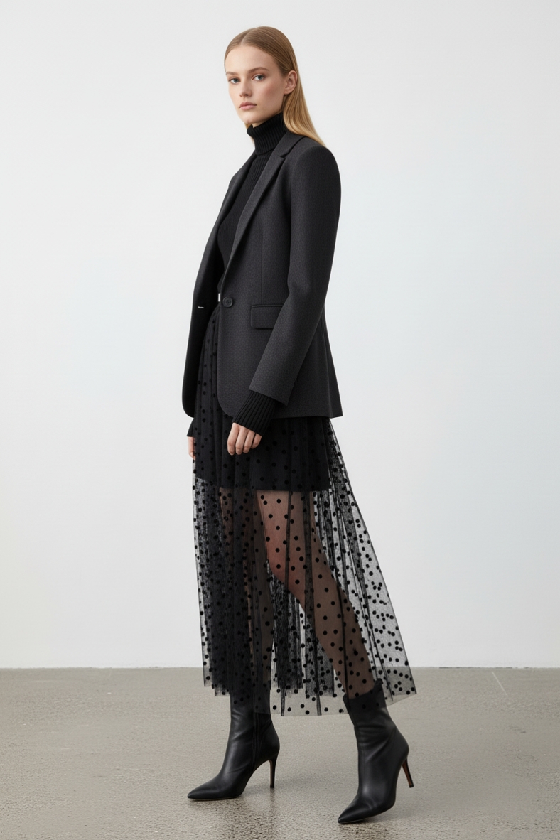 Per un look impeccabile, abbinala a un maglione a collo alto in maglia fine, per un contrasto di texture che esalta la leggerezza della gonna. Completa il tuo outfit con un blazer strutturato, per un tocco di classe, e stivali alti in pelle per slanciare la figura. Non dimenticare di aggiungere accessori minimalisti, come orecchini a cerchio e una clutch elegante, per un effetto finale chic e raffinato.