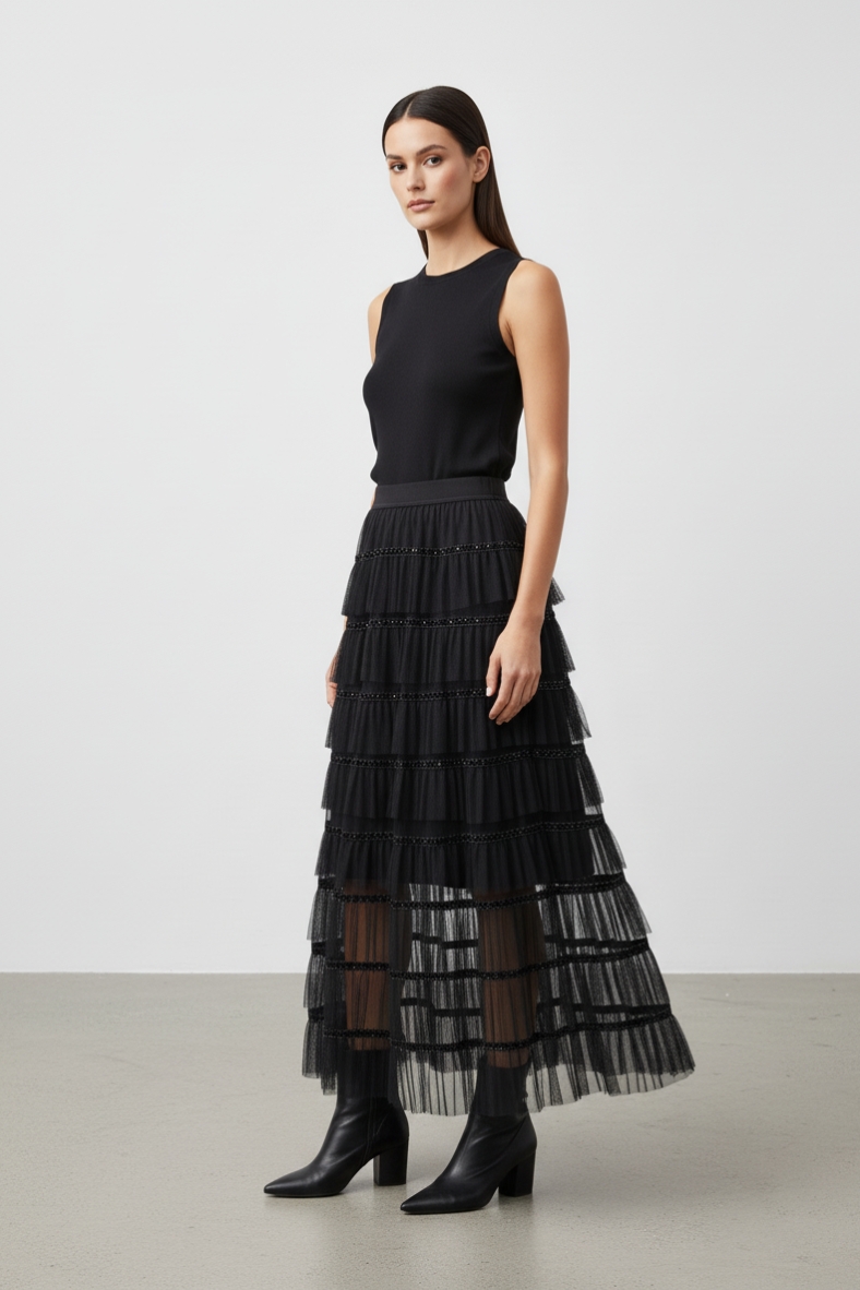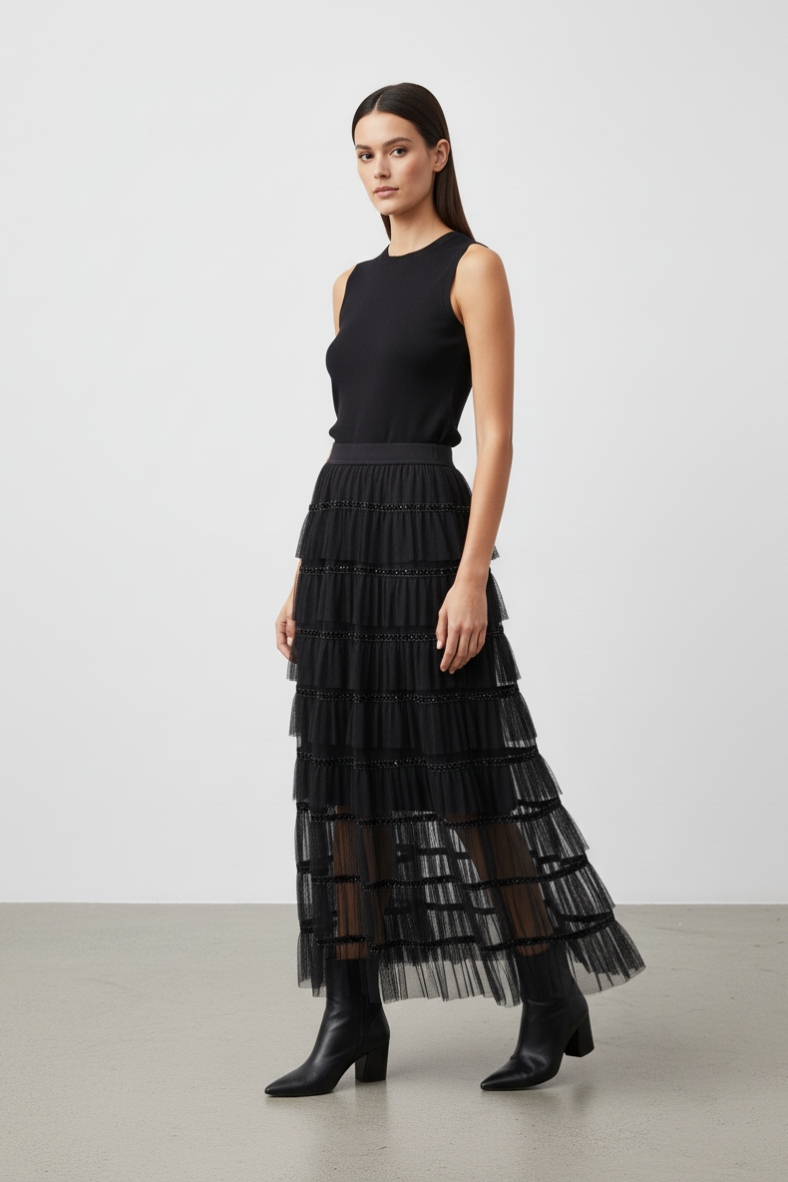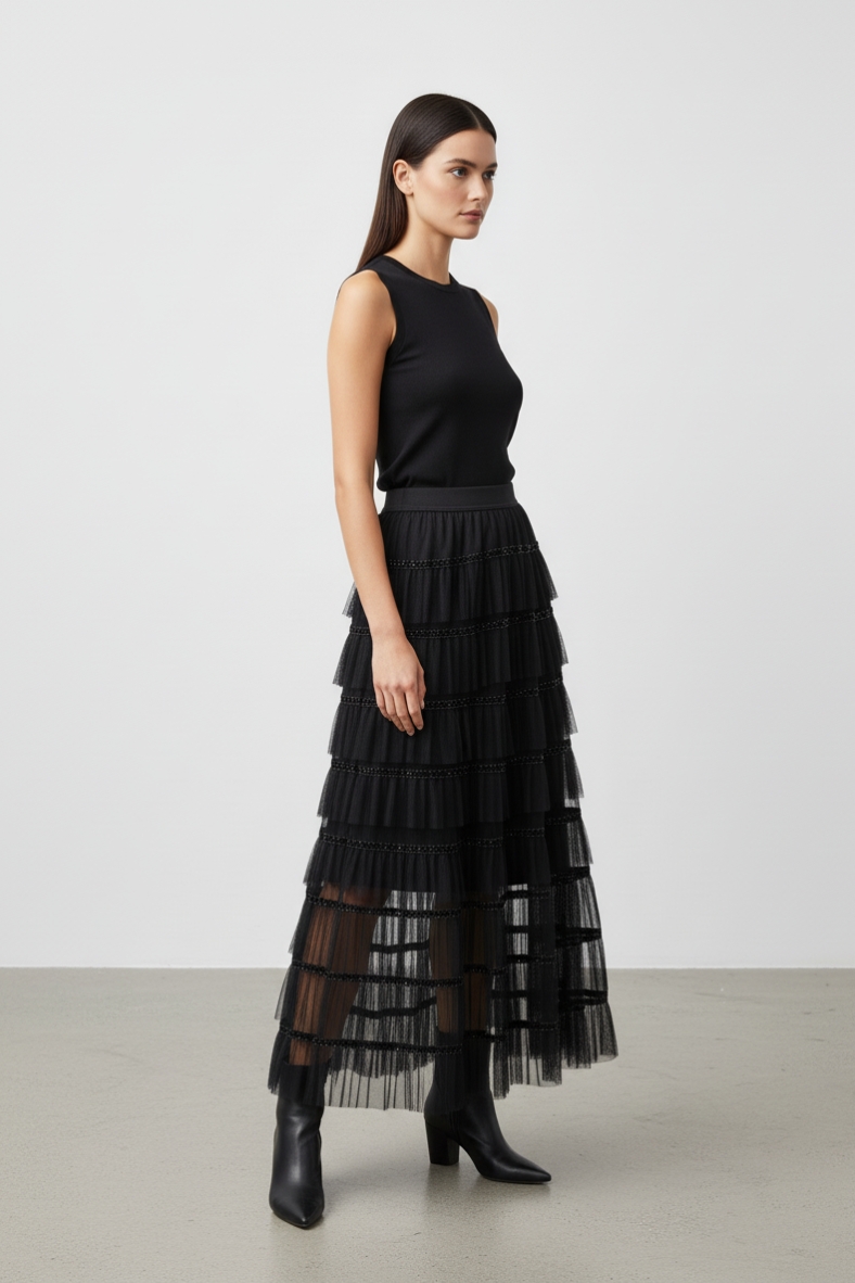 La gonna lunga con balze è il capo che non può mancare nel tuo armadio. Con il suo design sofisticato e le delicate balze che scendono in modo fluido, questa gonna è perfetta per creare look eleganti e femminili. Realizzata in cotone di alta qualità, offre una sensazione di morbidezza al tatto, rendendola ideale per le giornate autunnali e invernali. Puoi abbinarla a un maglione oversize per un look casual-chic, oppure optare per una blusa elegante per un’uscita serale. Gli stivali alti sono l’accessorio perfetto per completare il tuo outfit, donando un tocco di classe e slancio. Non dimenticare di aggiungere una cintura in vita per accentuare la silhouette e dare un tocco di personalità al tuo look. Questa gonna è versatile e si presta a molteplici abbinamenti, rendendola un investimento sicuro per la tua collezione di moda. Sia che tu stia cercando un look per il lavoro o per un evento speciale, la gonna lunga con balze saprà sempre sorprenderti con il suo fascino senza tempo.